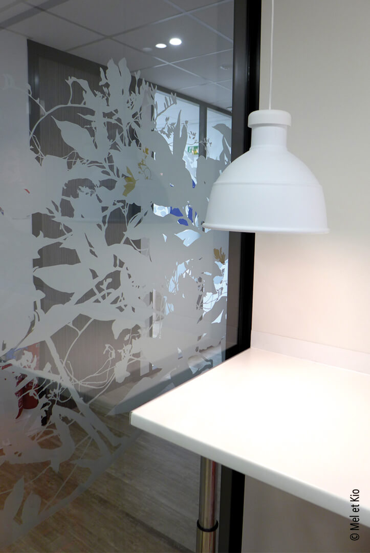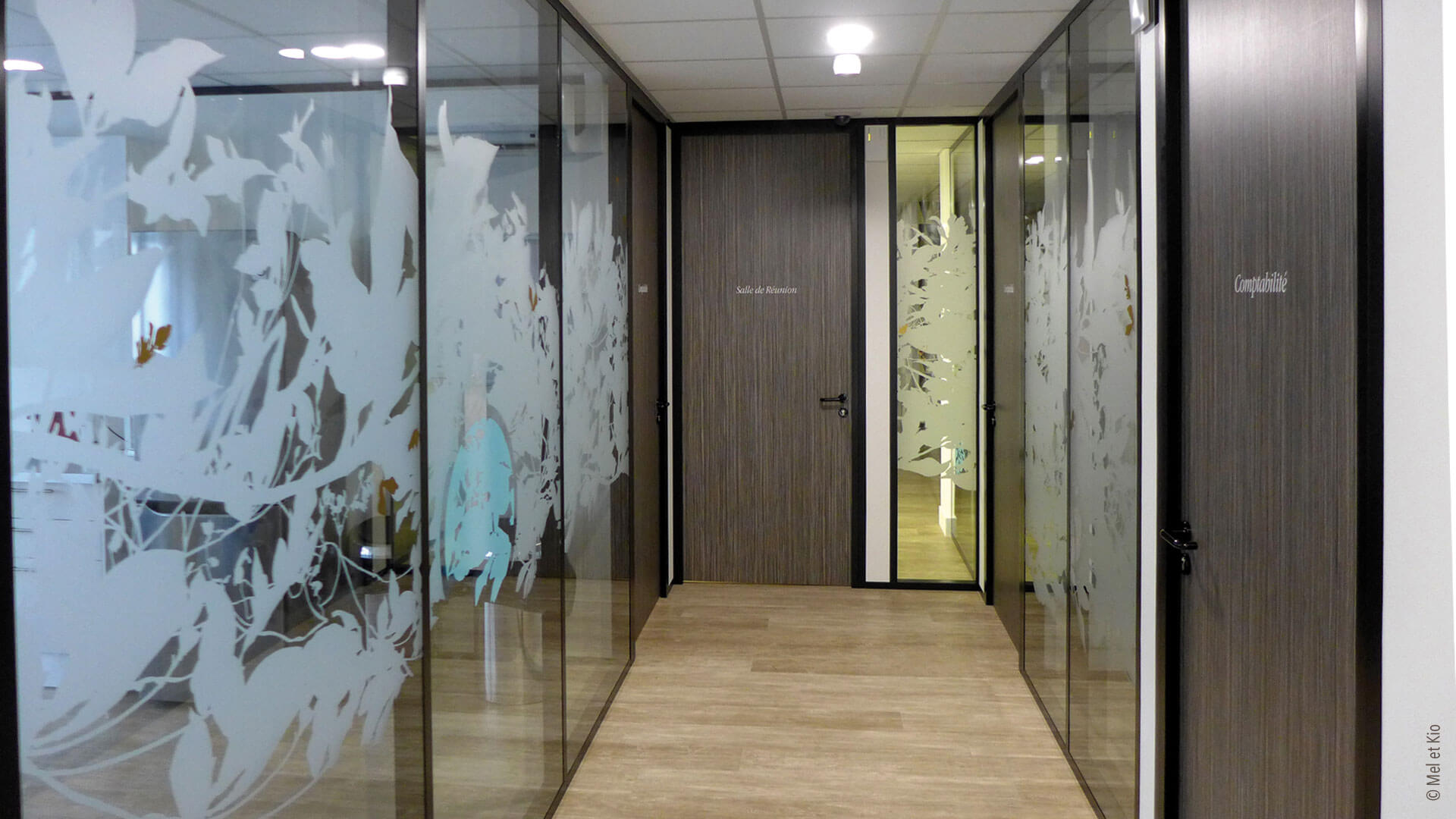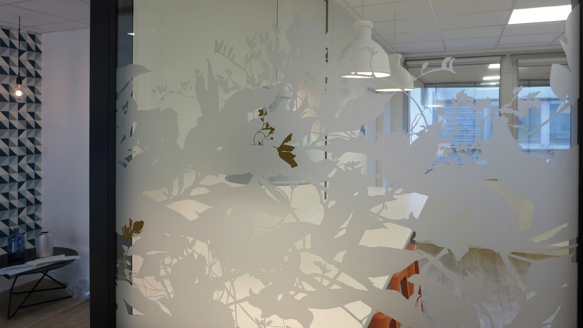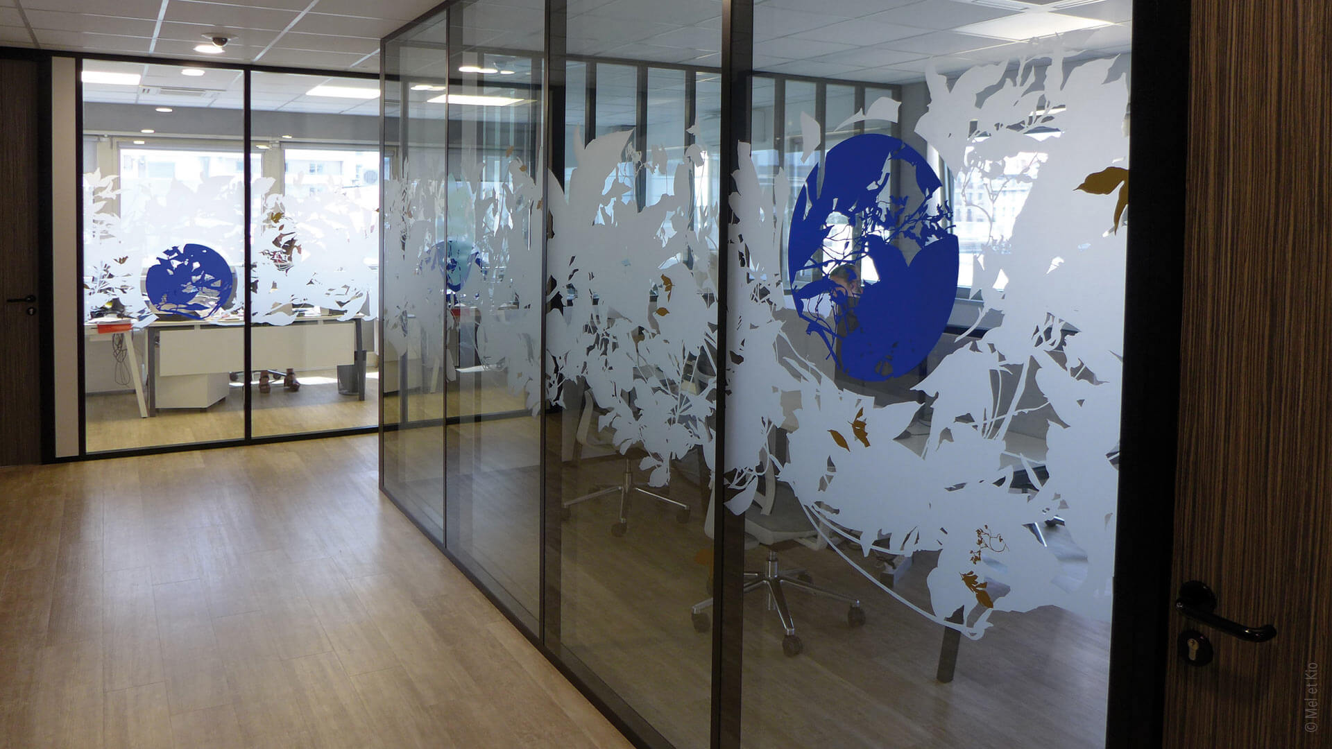 Décoration murale et vitrophanie végétale des cloisons vitrées des bureaux et circulation