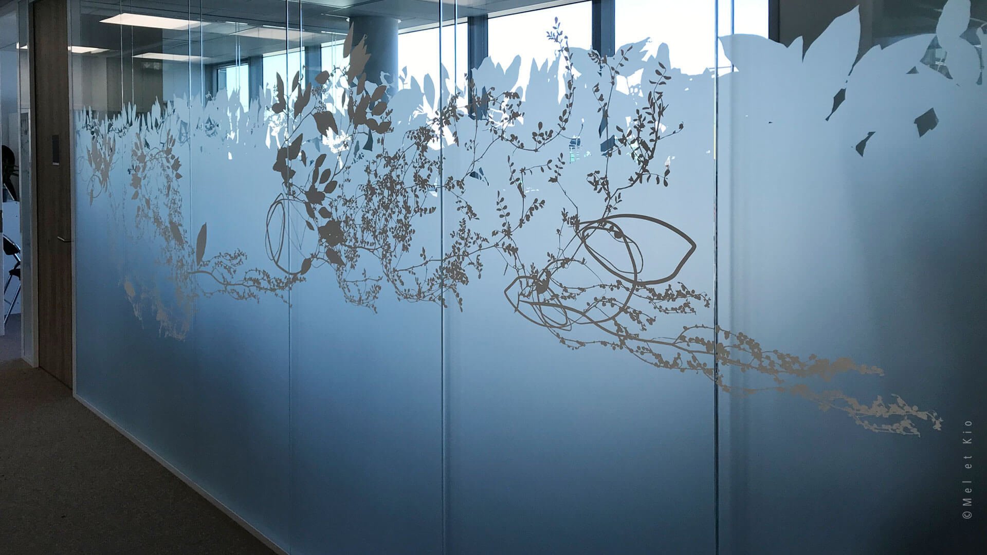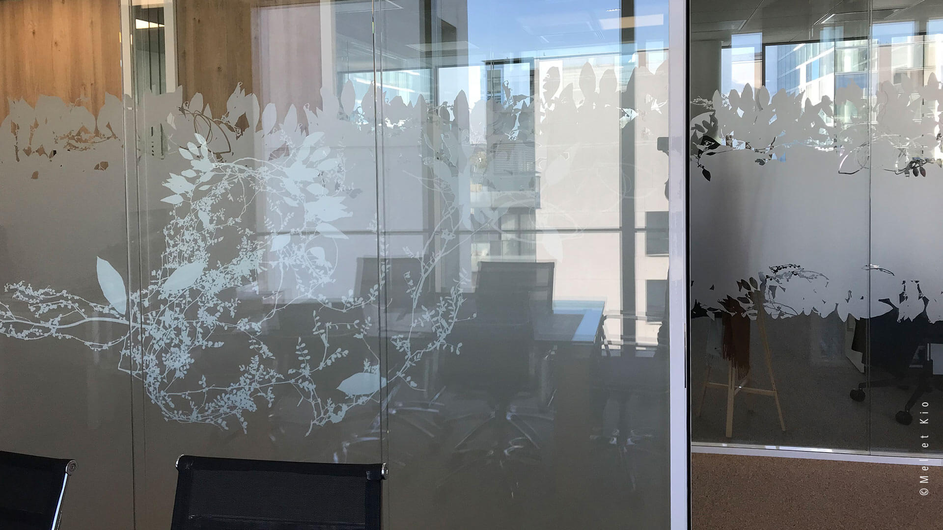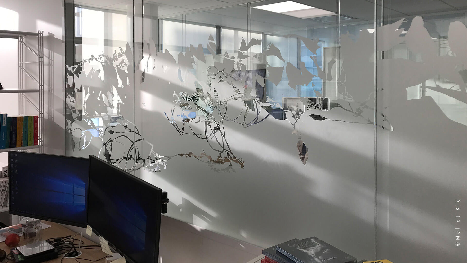 Vitrophanie sur mesure pour cloisons vitrées de bureaux au motifs de végétation graphique.