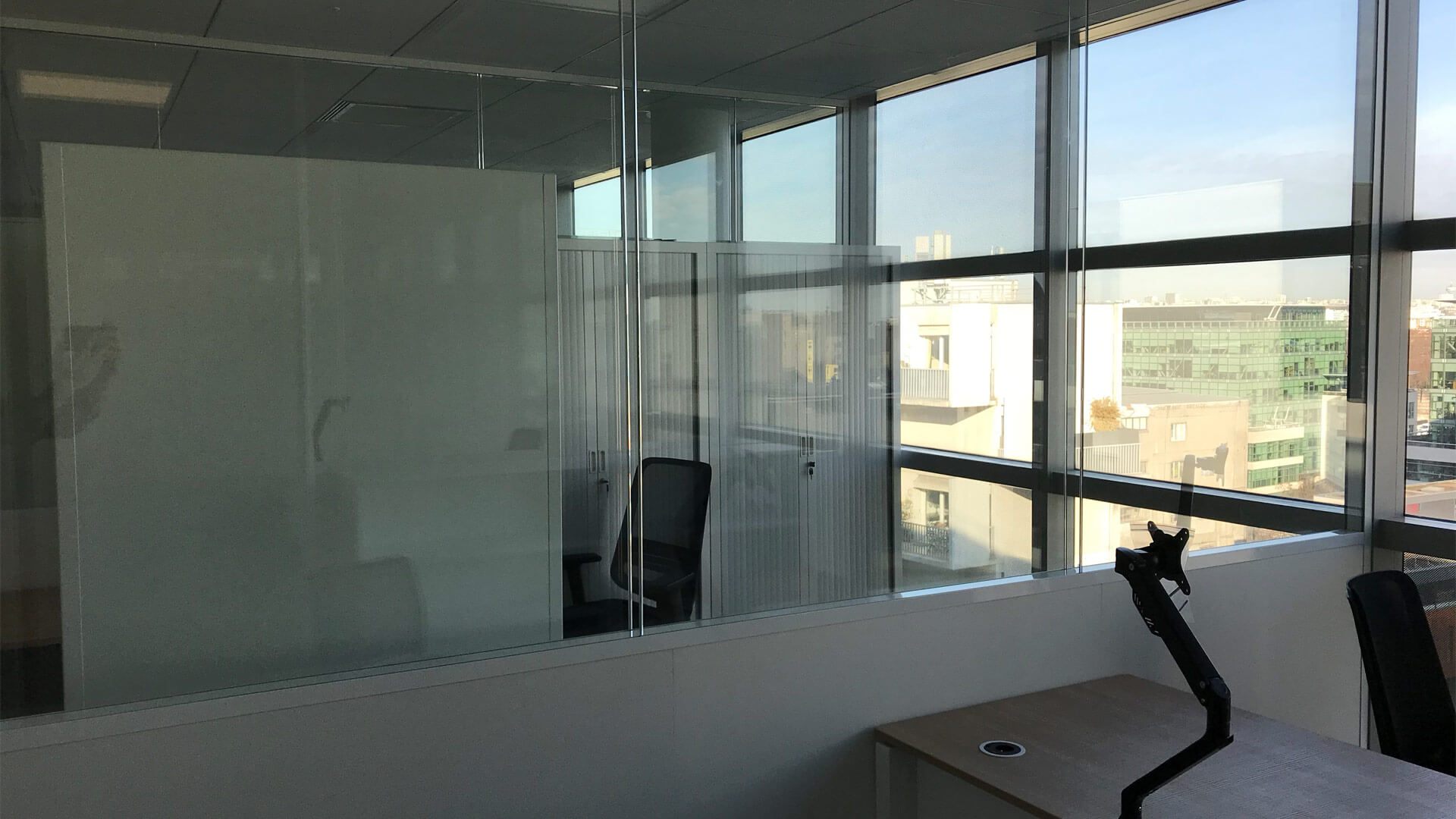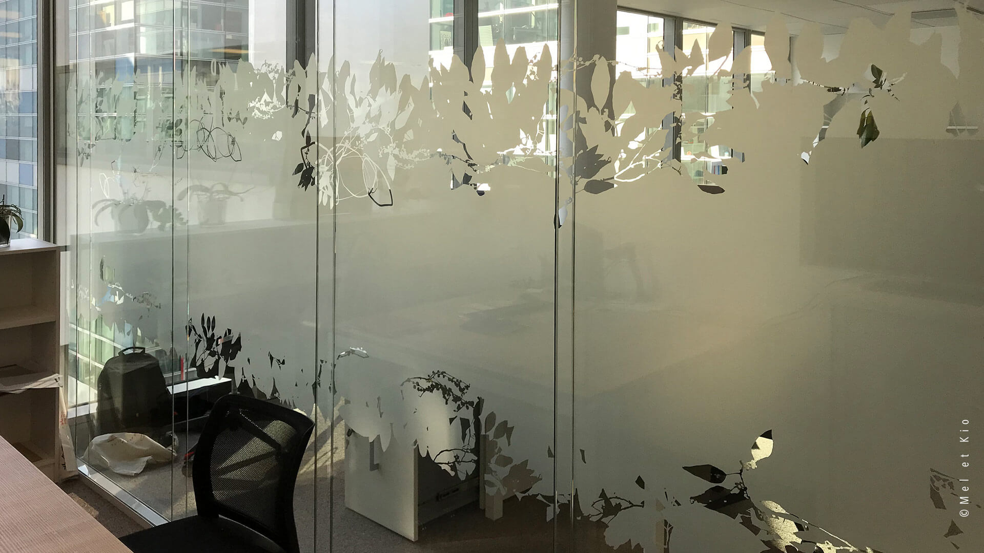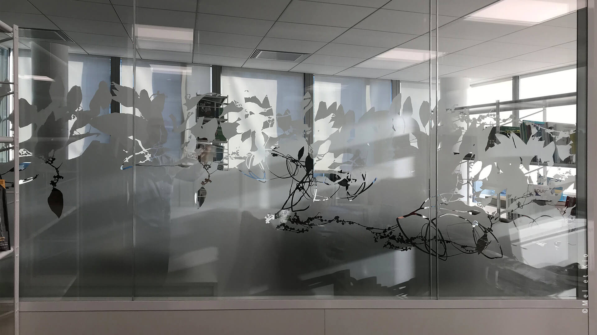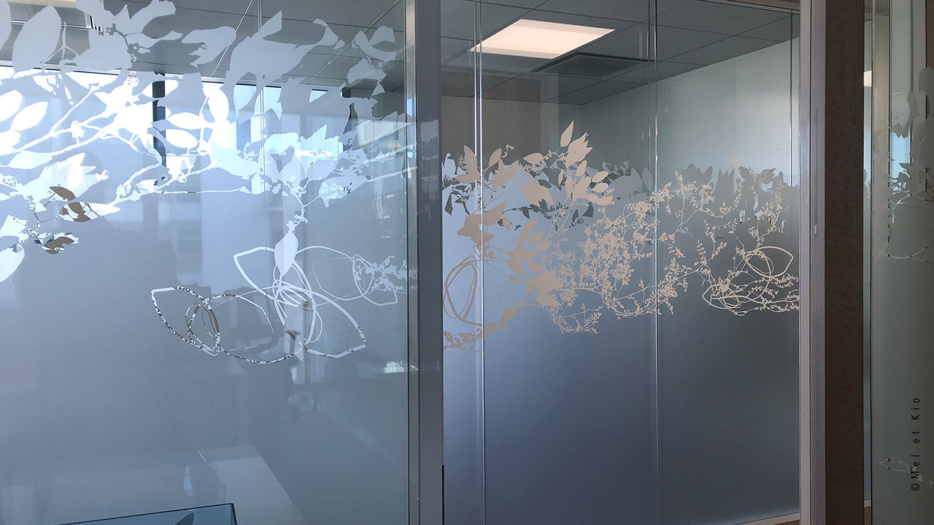 Vitrophanie sur mesure pour cloisons vitrées de bureaux au motifs de végétation graphique.