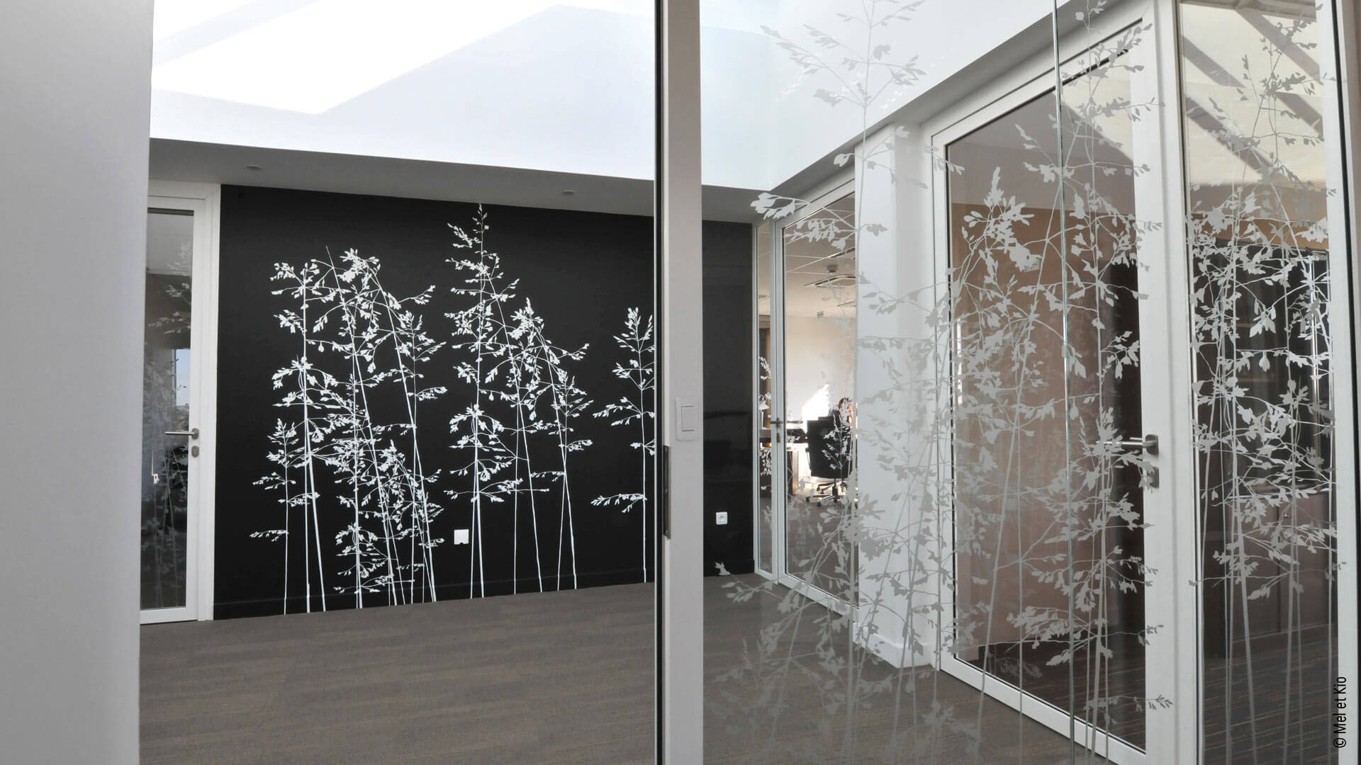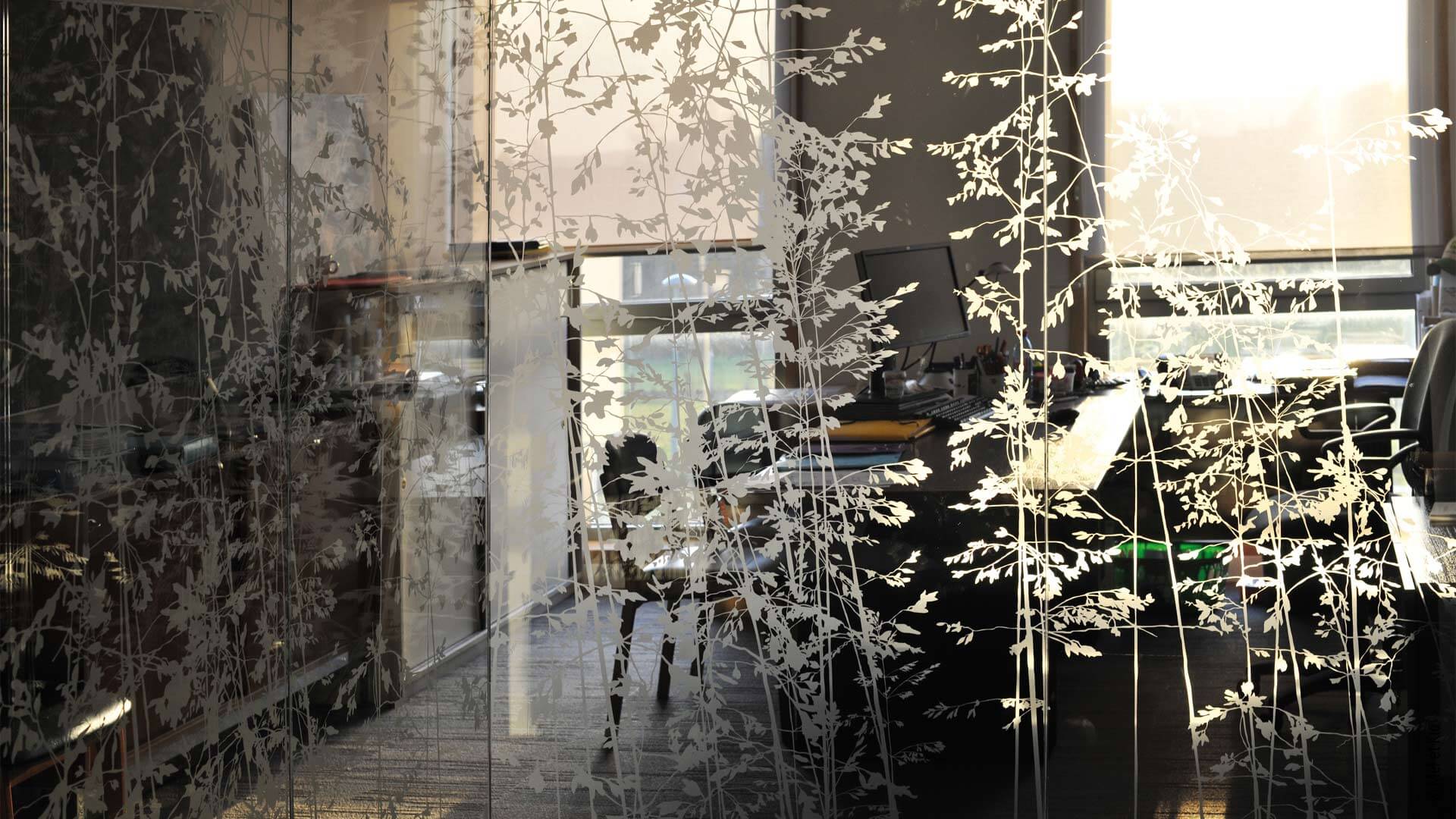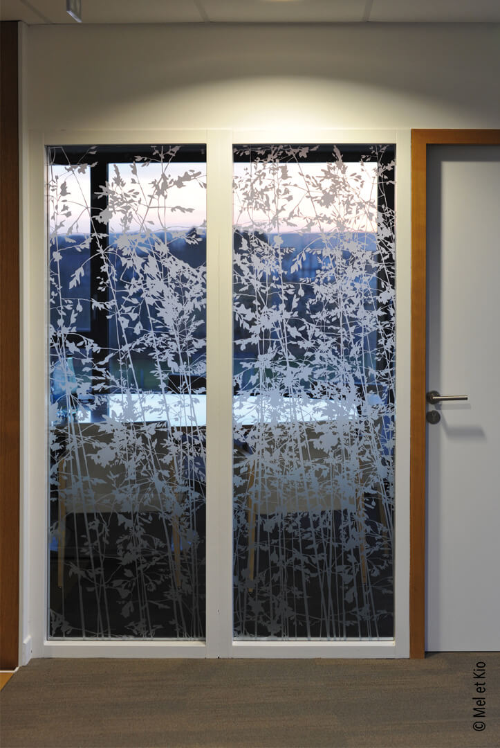 Vitrophanie sur cloisons vitrées de bureaux du siège social groupe C.B.