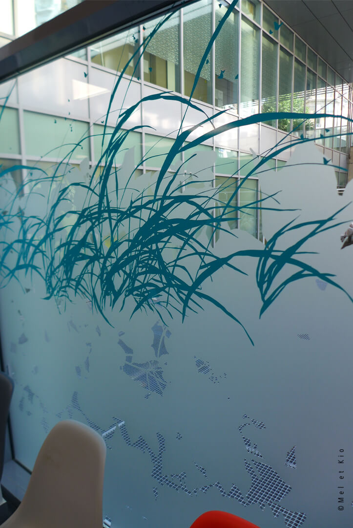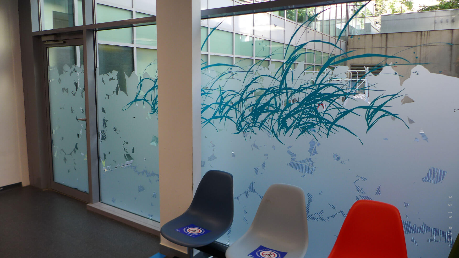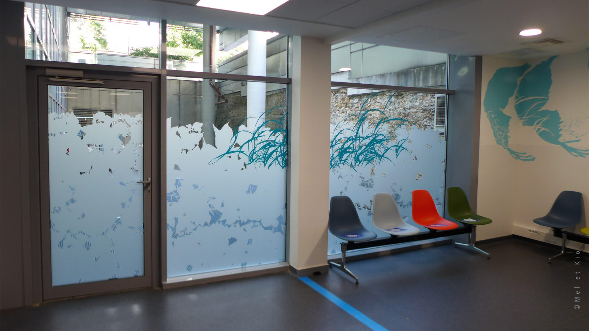 Vitrophanie Brise vue de l’extérieur de la salle d’attente du service des Urgences de l’hôpital Tenon à Paris. Le film occultant travaillé permet de conserver toute la luminosité dans l’espace et le dessin végétal est en cohérence avec le design mural.