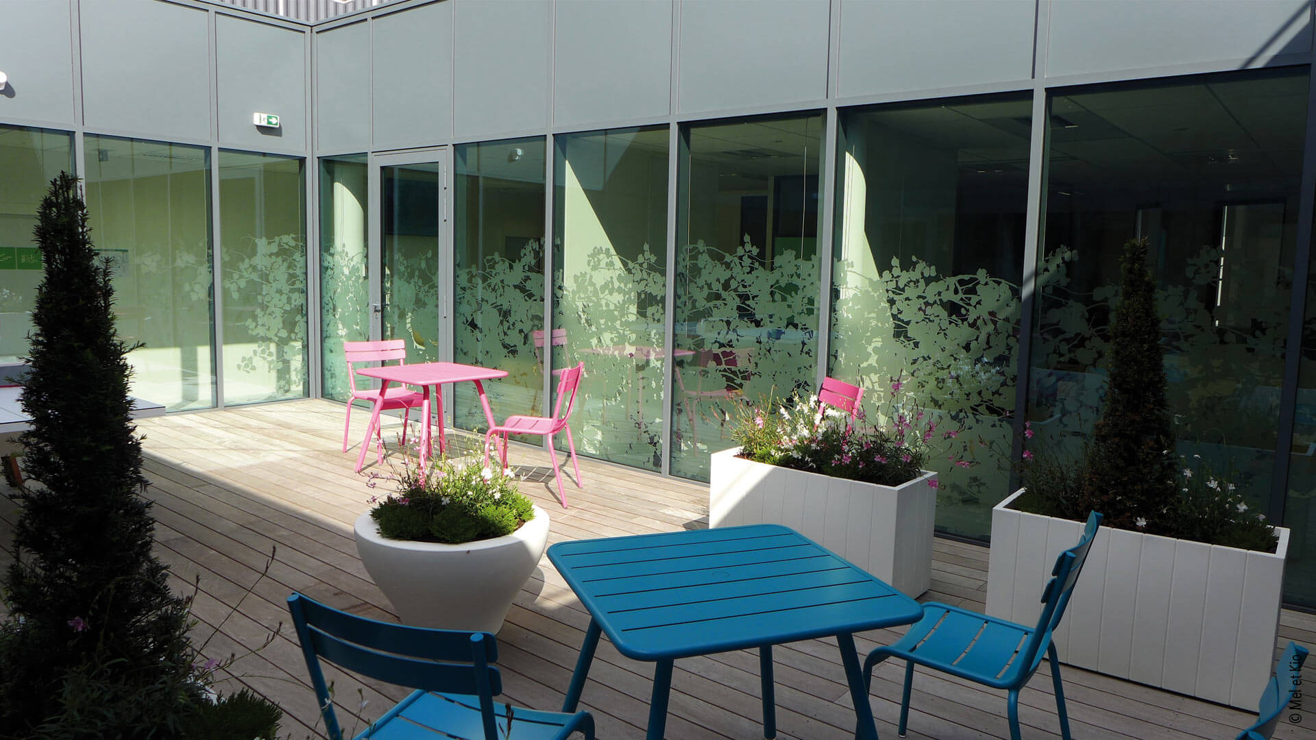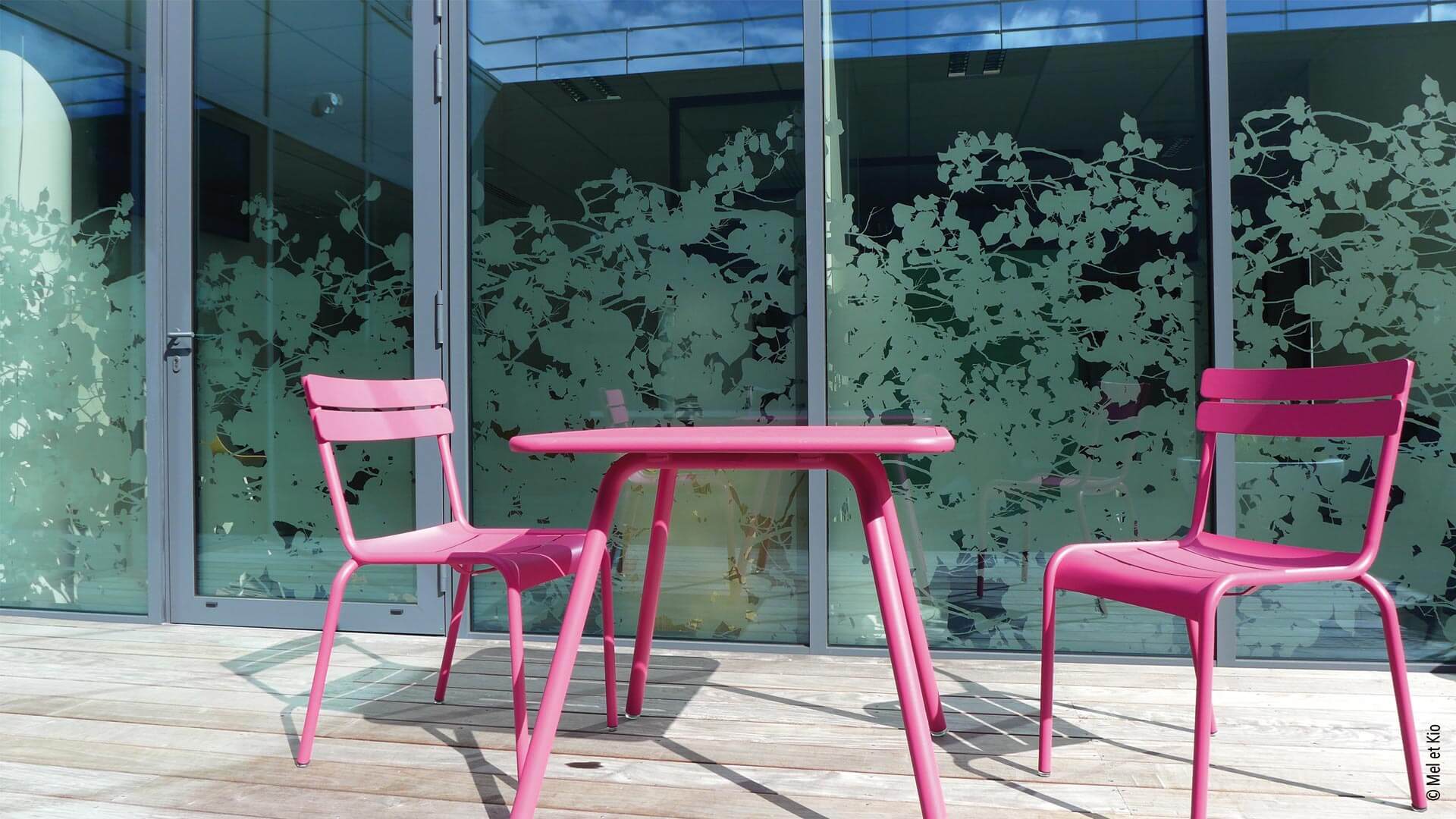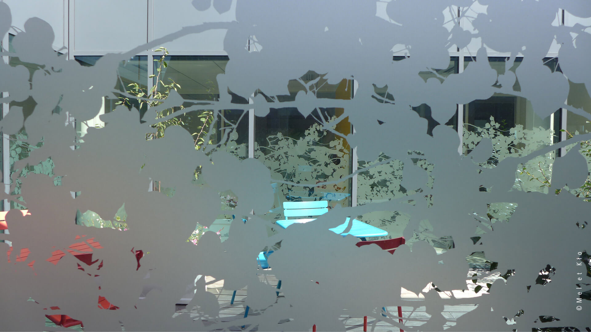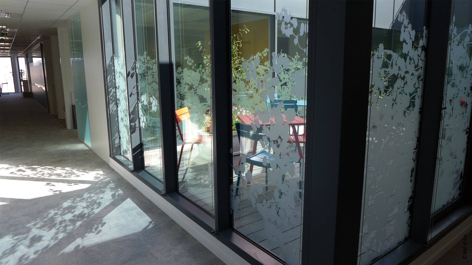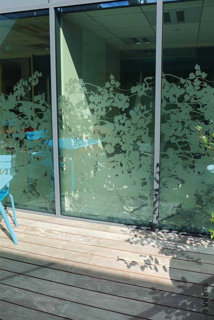 Réalisation sur mesure d’une vitrophanie dépoli végétale sur cloisons vitrées.