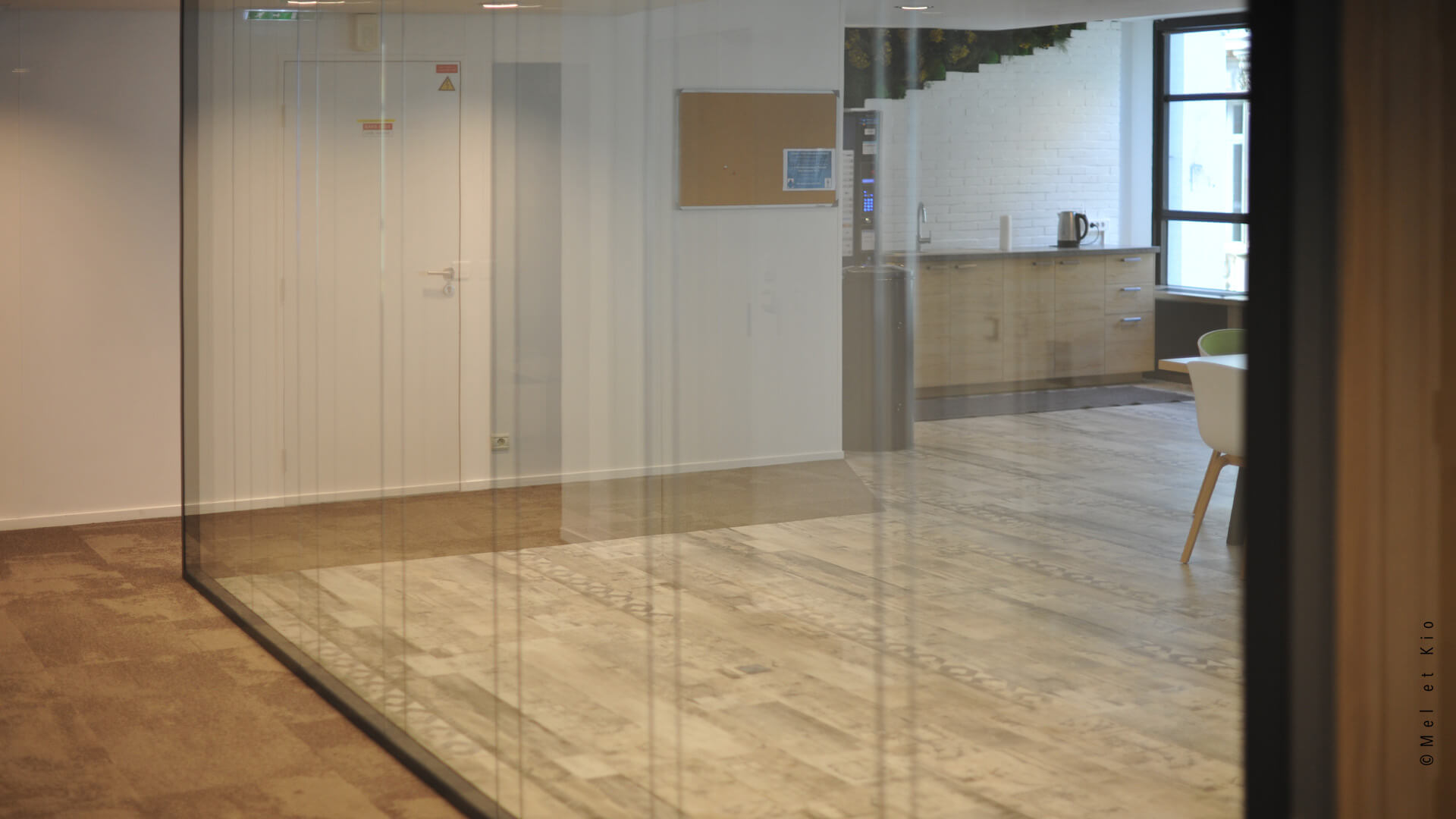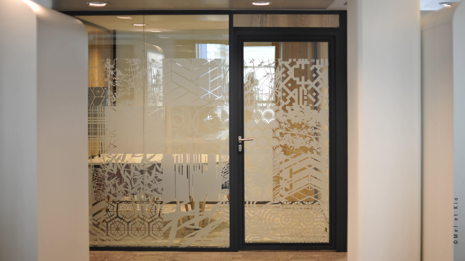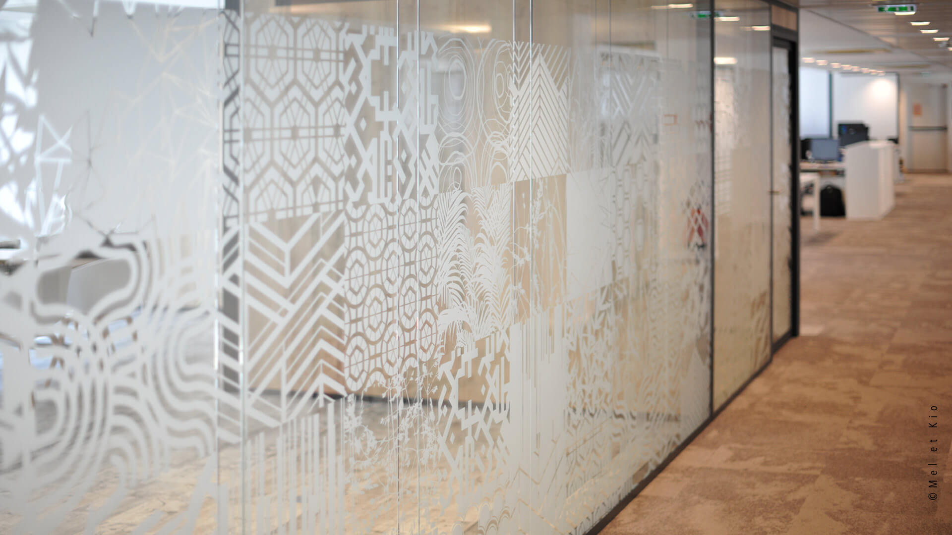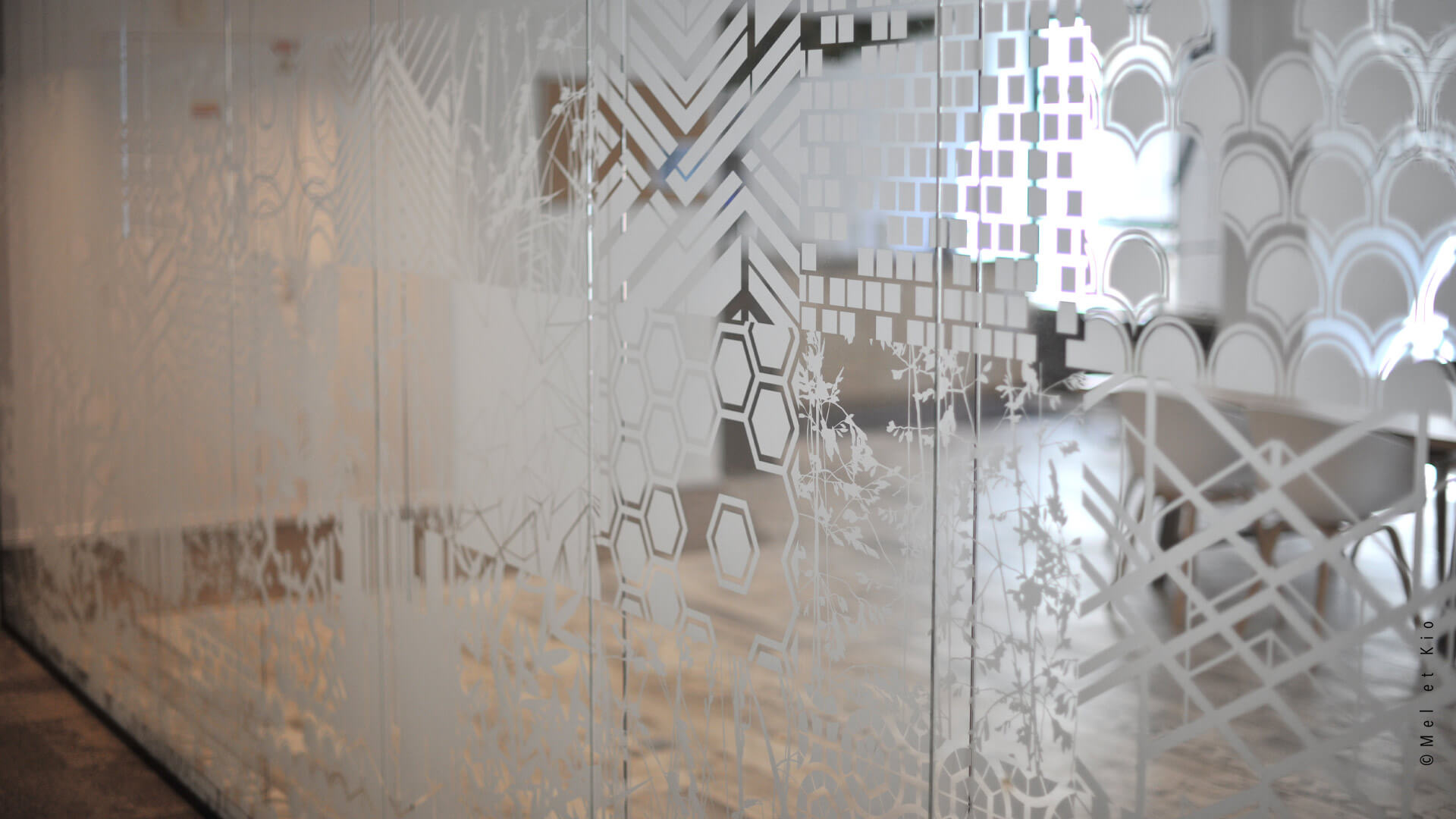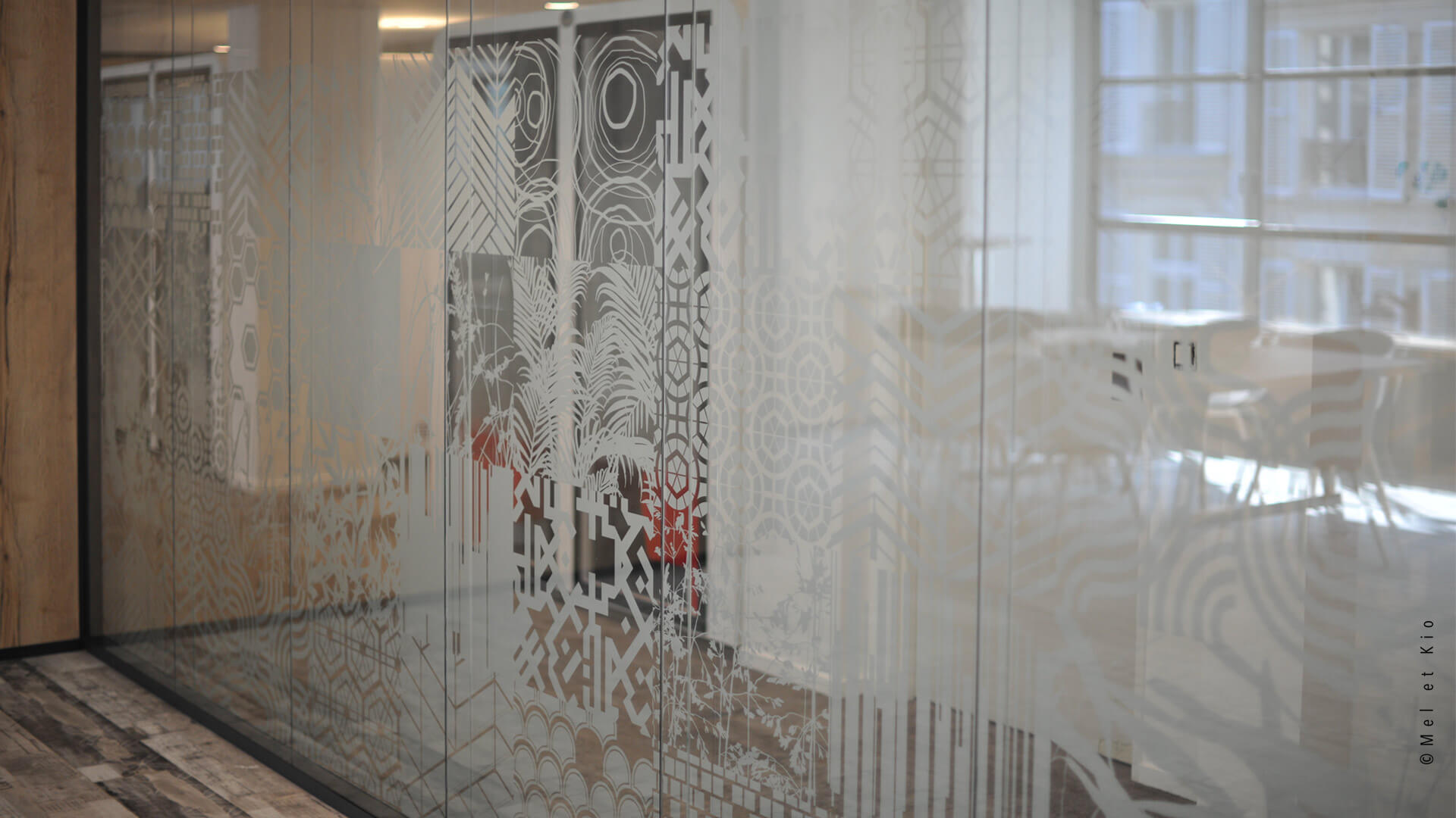 Dépoli réalisé à la main sur baies vitrées de bureaux cafétéria d’entreprise.