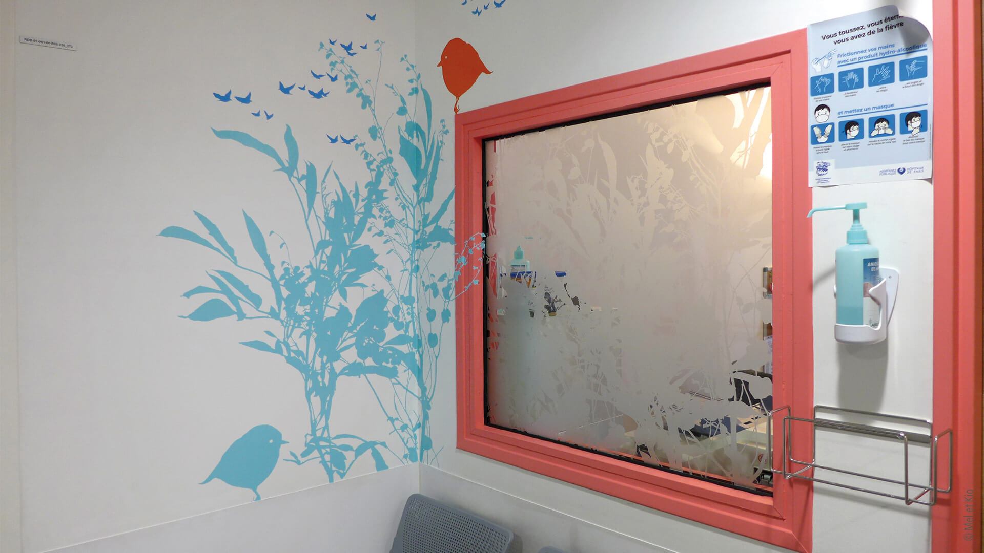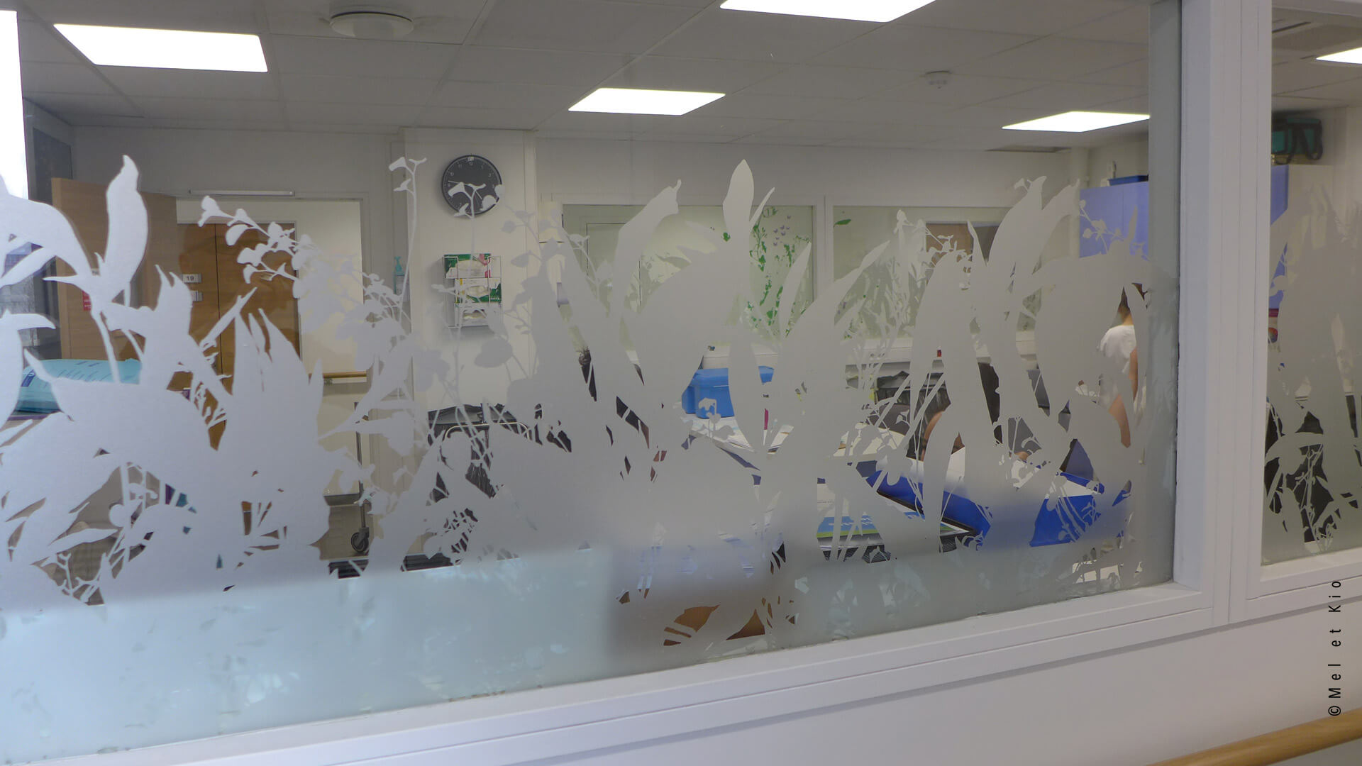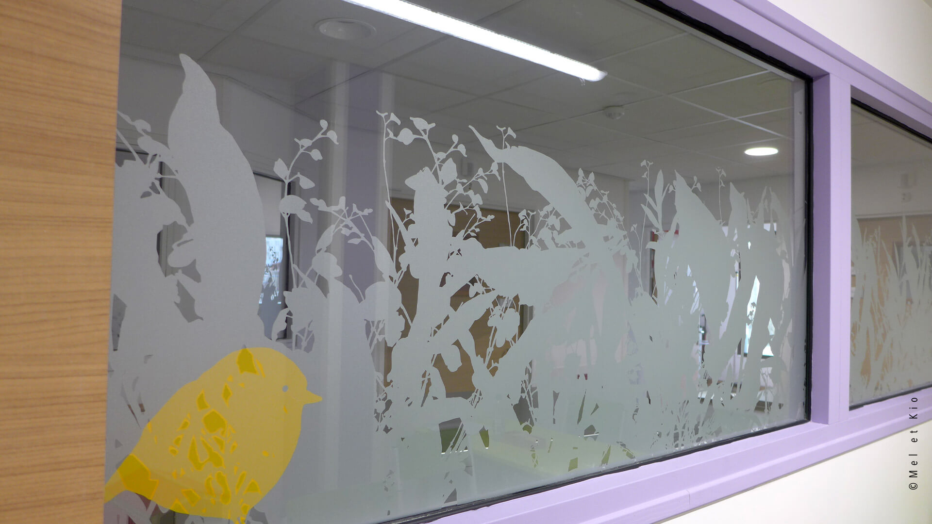 Vitrophanie sur les vitres du Pôle chirurgie pédiatrique. Le dépoli est une véritable alternative aux stores. Il sert de brise vue et ne contraint pas la luminosité.