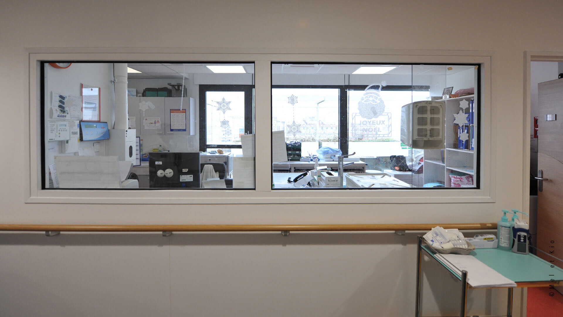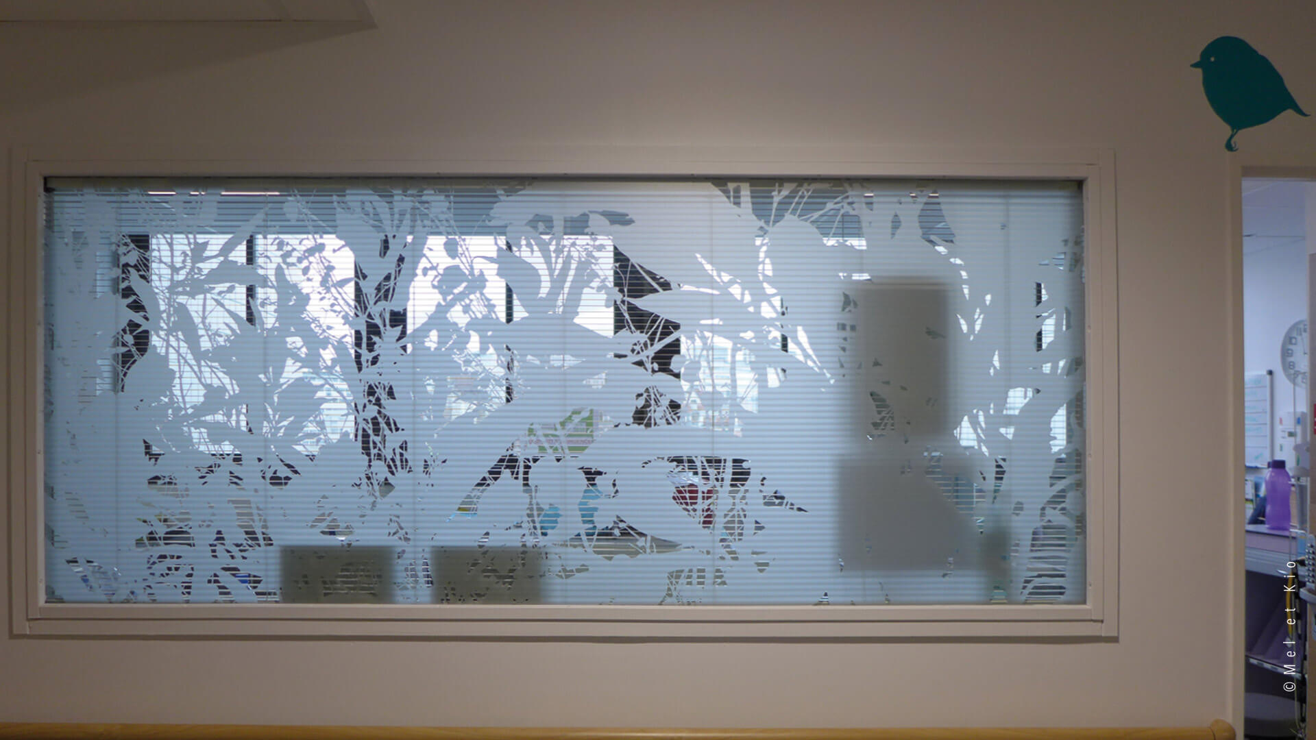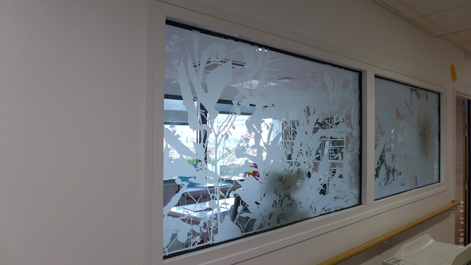Vitrophanie sur les vitres du Pôle chirurgie pédiatrique. Le dépoli est une véritable alternative aux stores. Il sert de brise vue et ne contraint pas la luminosité.