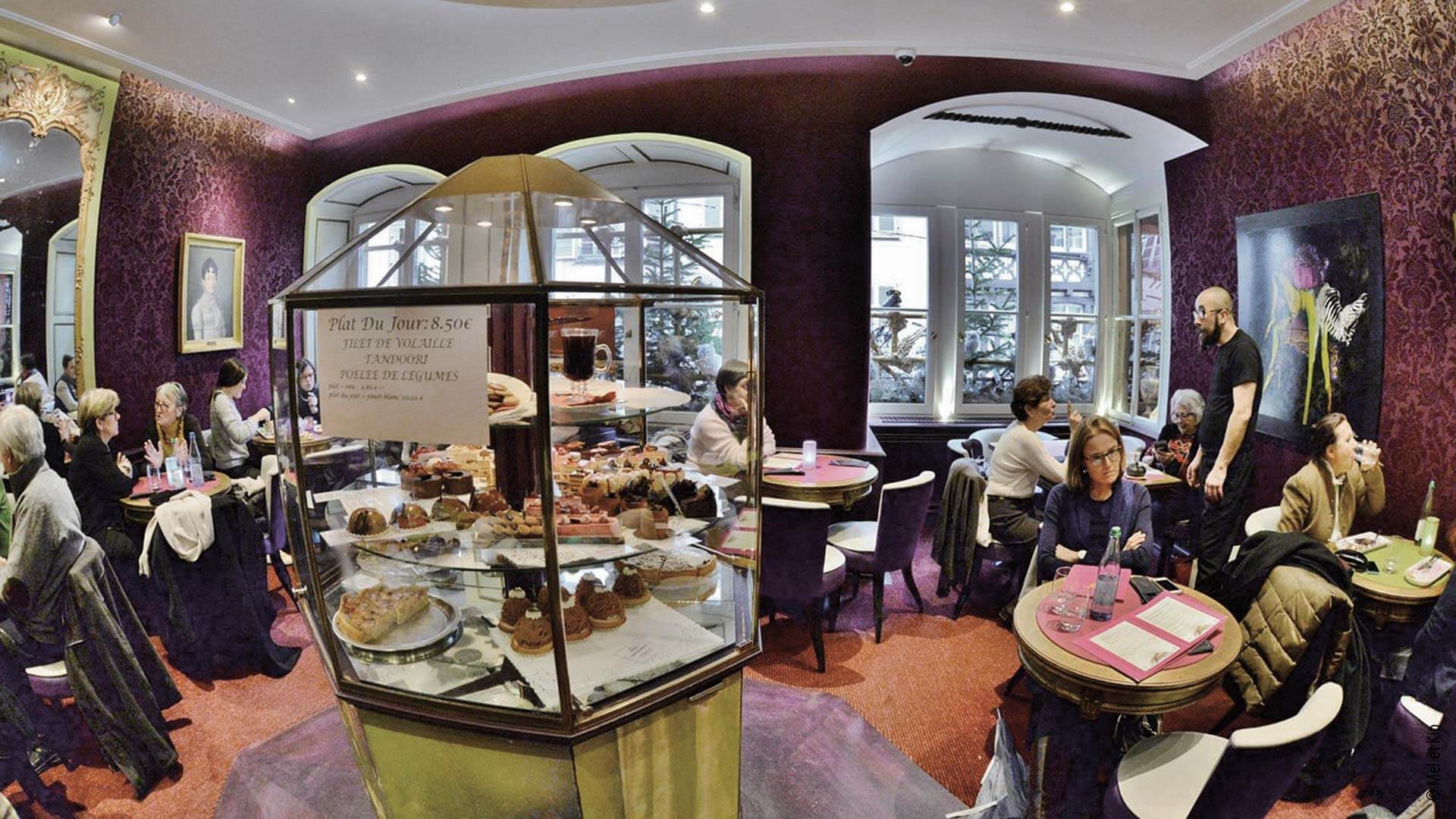 Vitrophanie sur baies vitrées et décorations de vitrines de la pâtisserie salon de thé Christian à Strasbourg