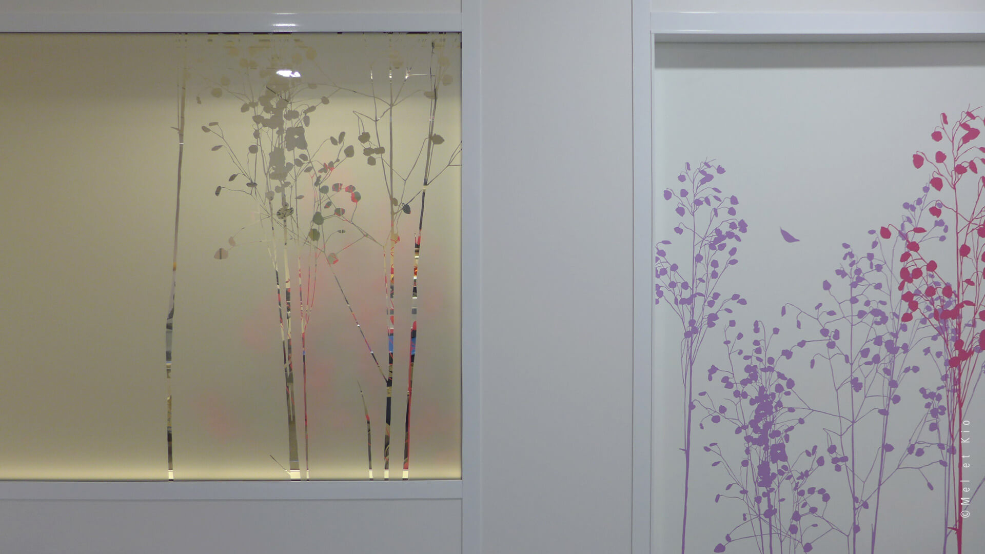 Vitrophanie représentant des végétaux  et design mural inspirés de la collection ©Murmures pour le service Babinski