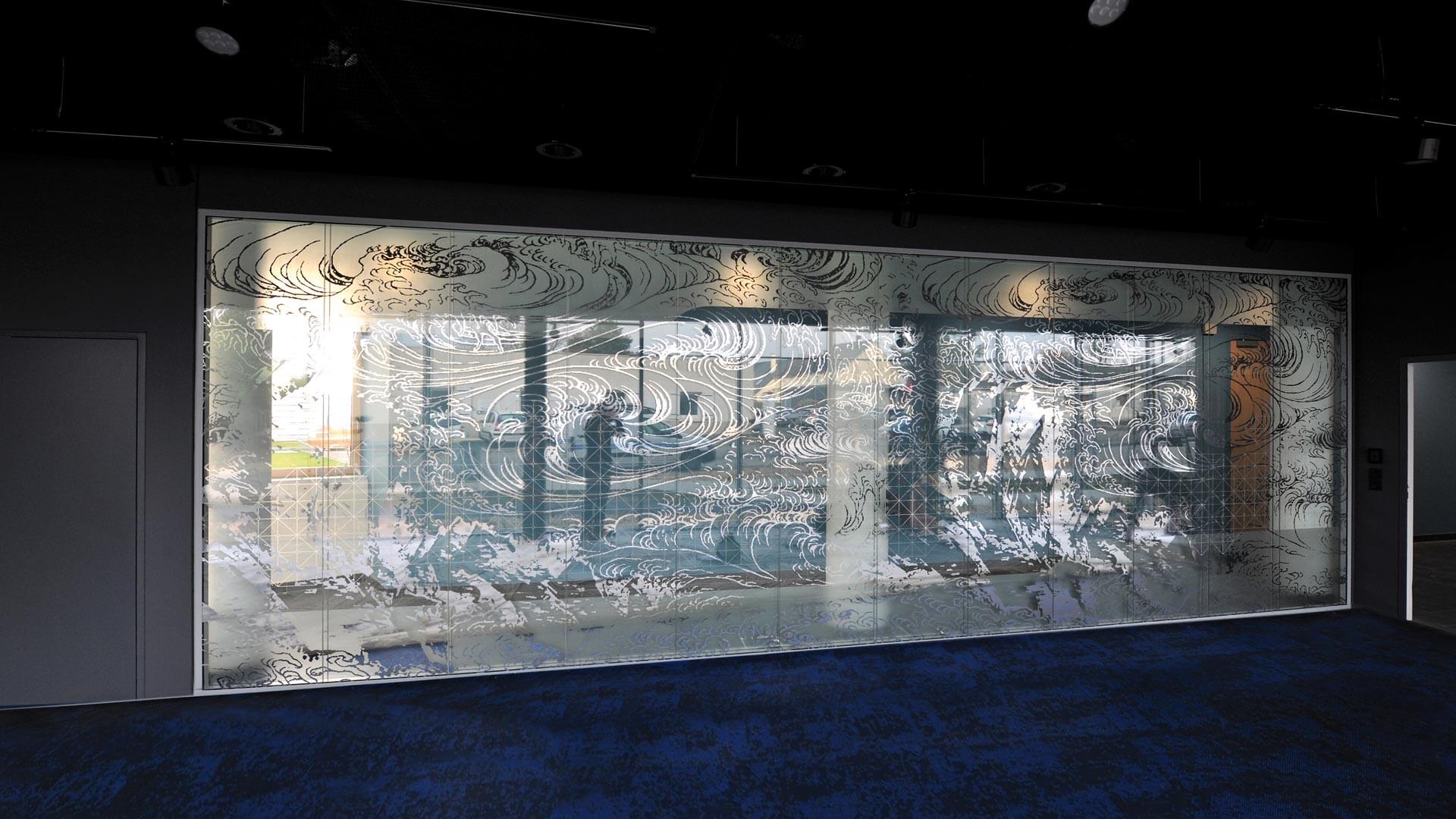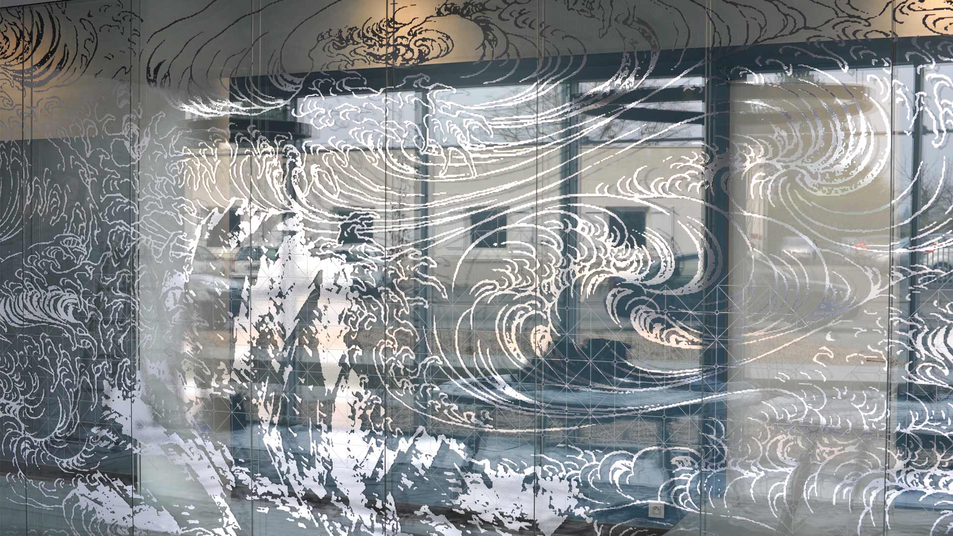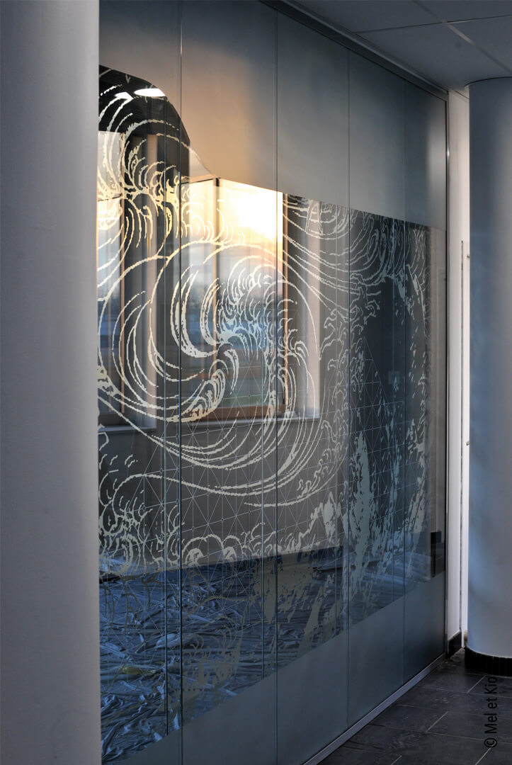 Décors sur vitres en vitrophanie miroir pour le show room de RTE à Nantes de La Grande Vague de Kanagawa, de Hokusai