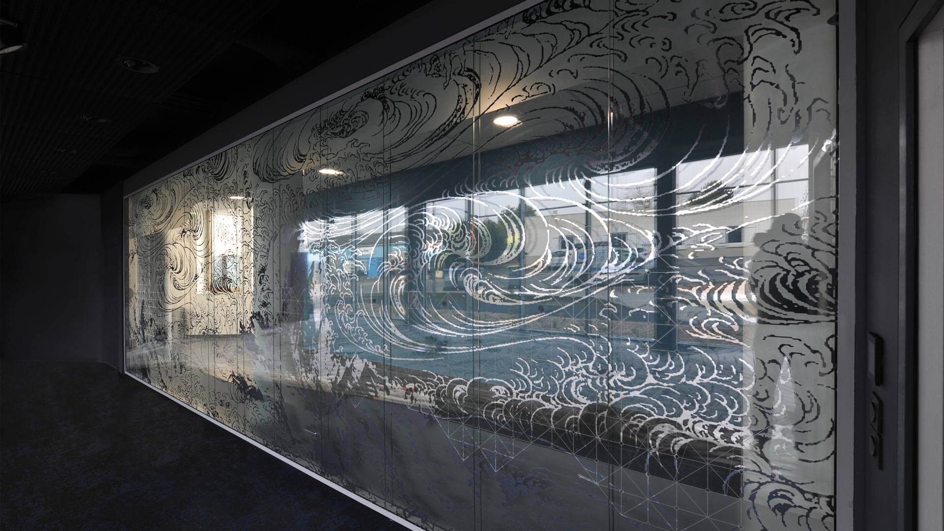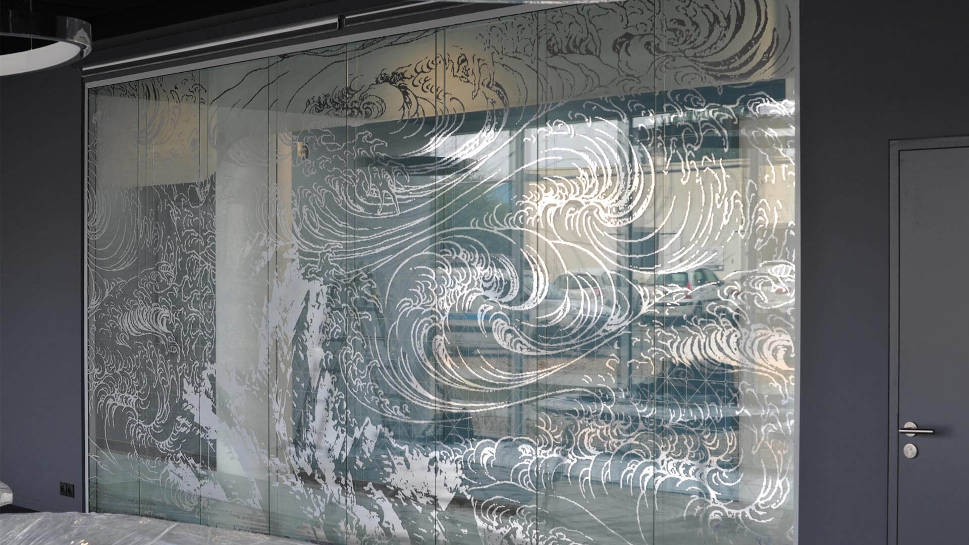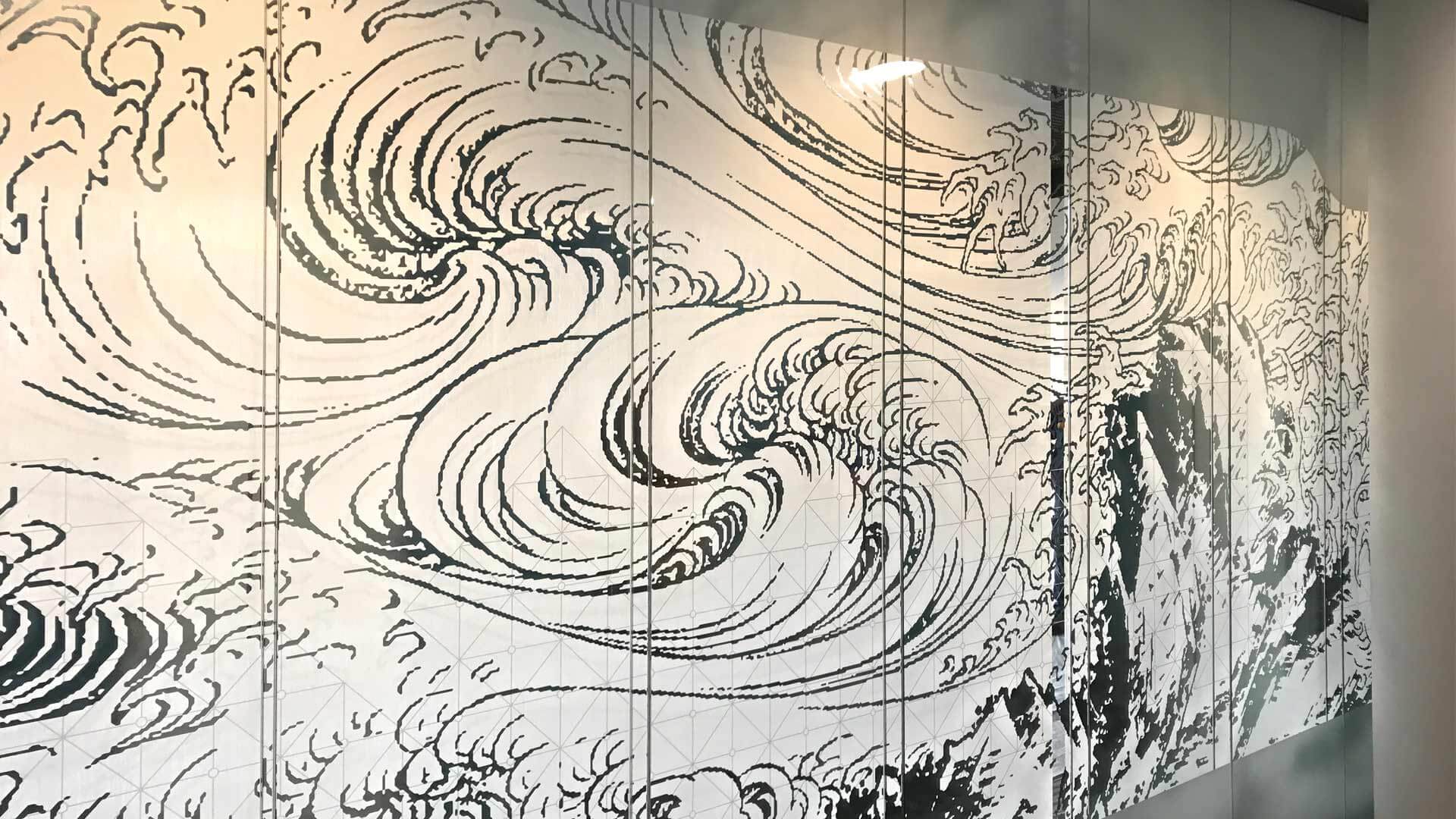 Décors sur vitres en vitrophanie miroir pour le show room de RTE à Nantes de La Grande Vague de Kanagawa, de Hokusai