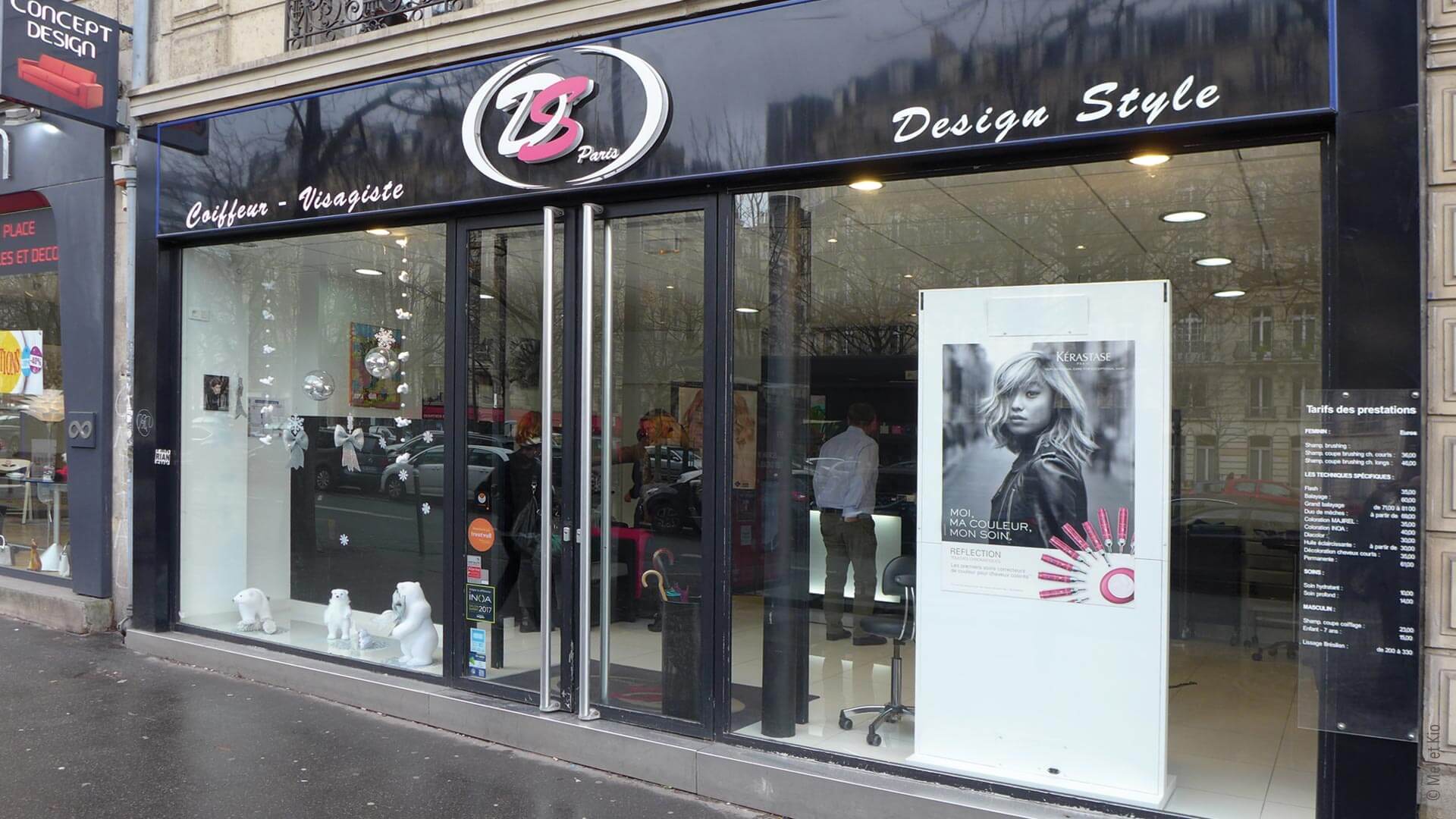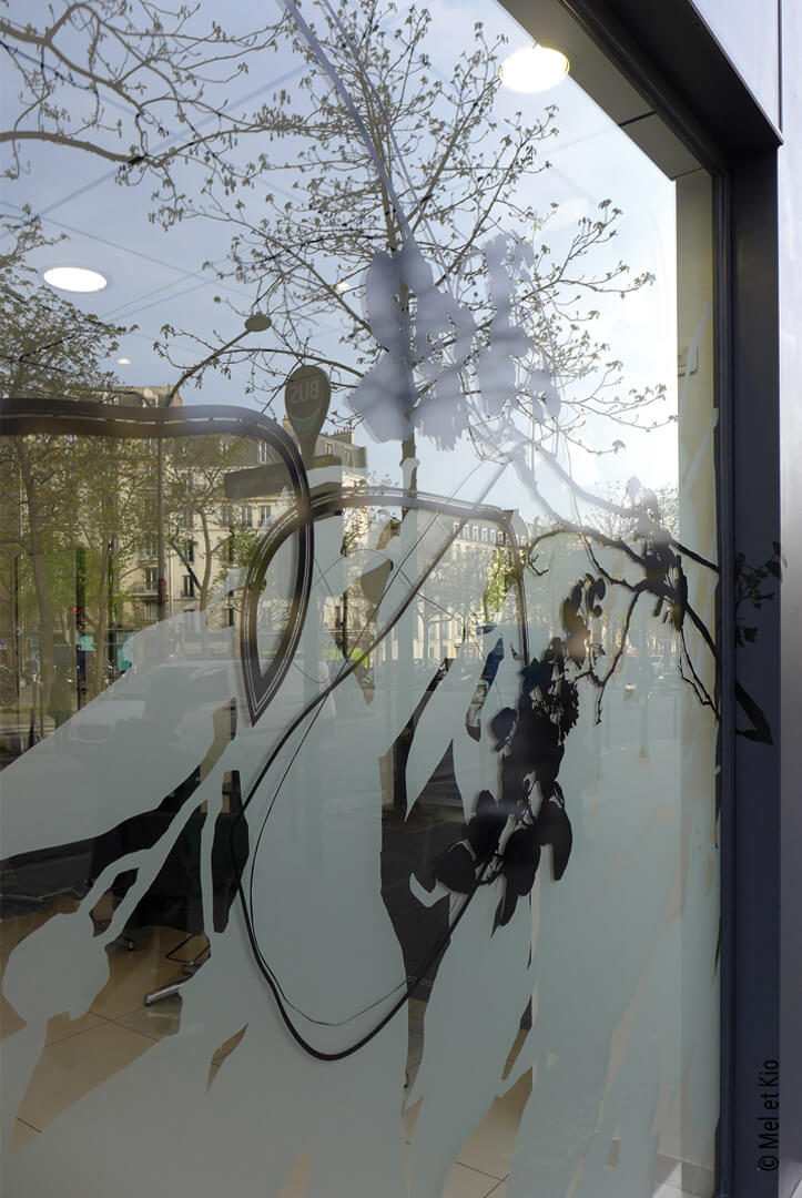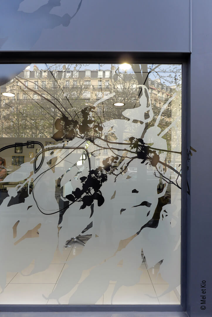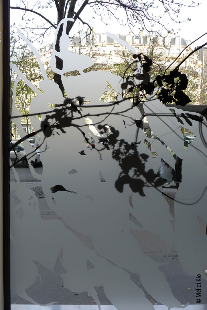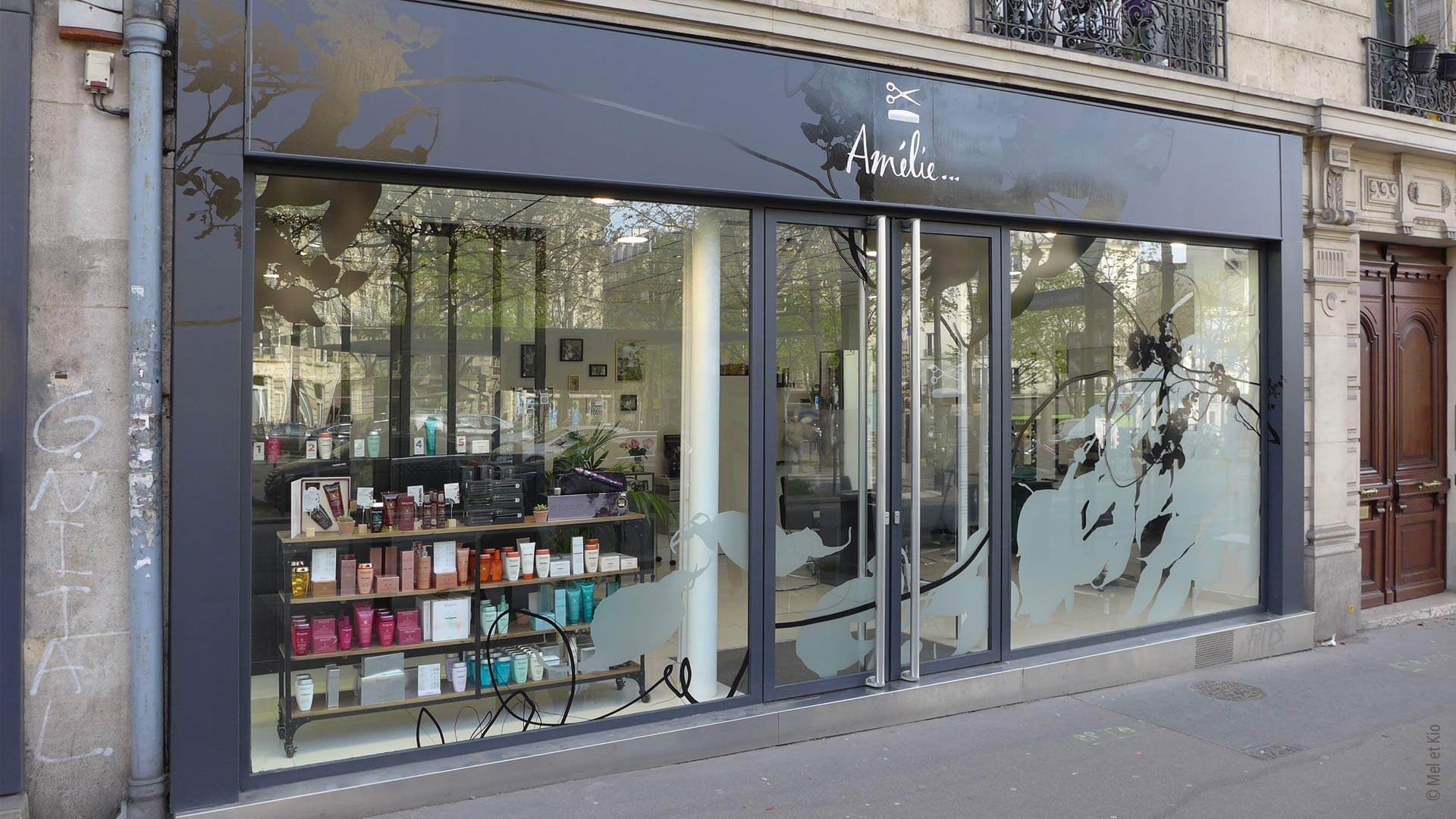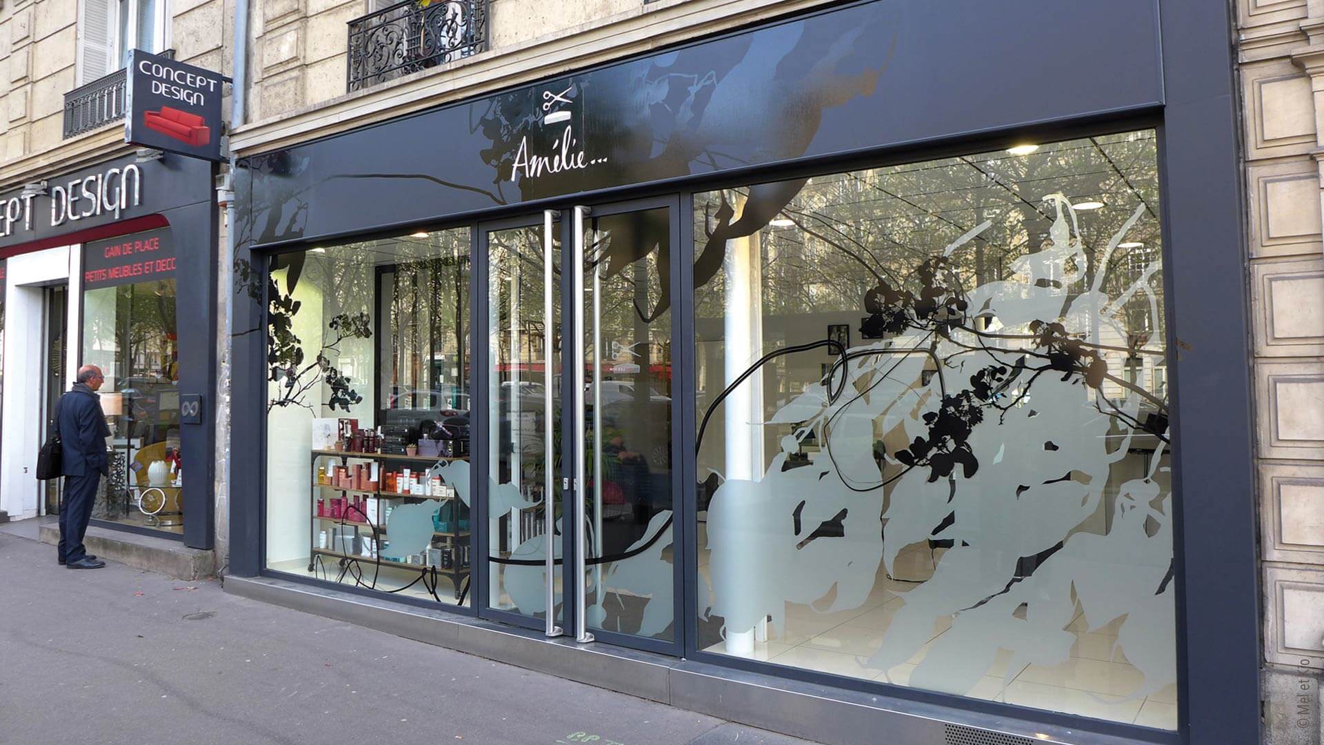 Salon de coiffure décoration vitrine originale. L’utilisation du film occultant est à la fois fonctionnelle et permet de donner une identité particulière au lieu.