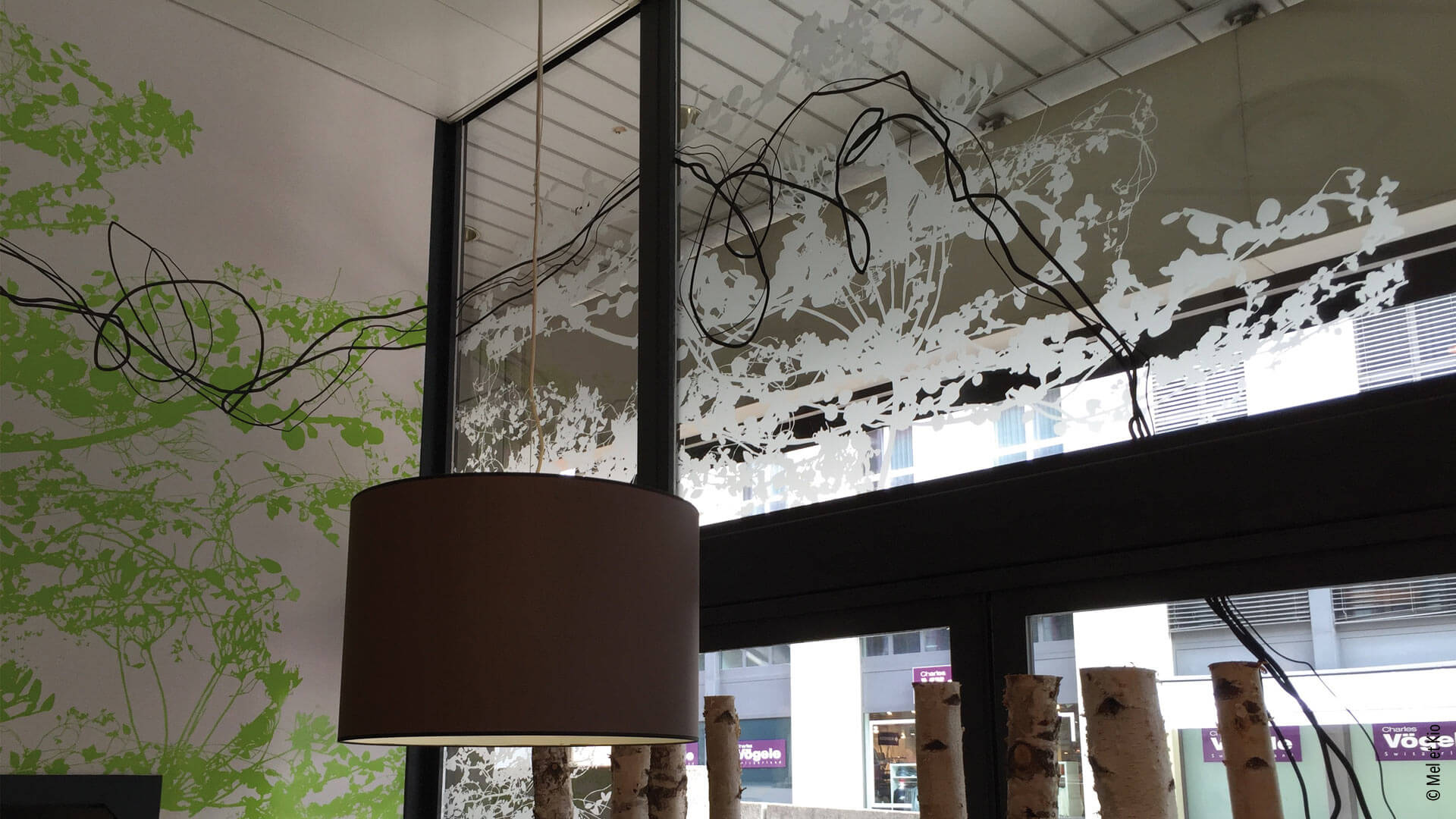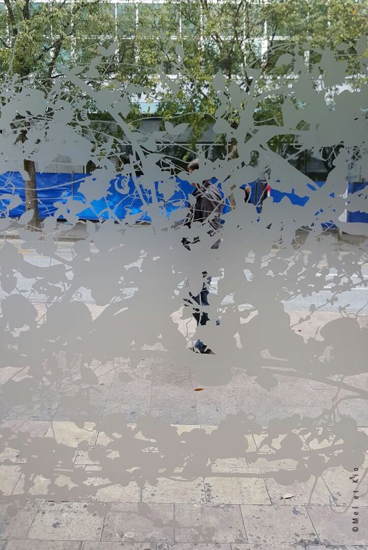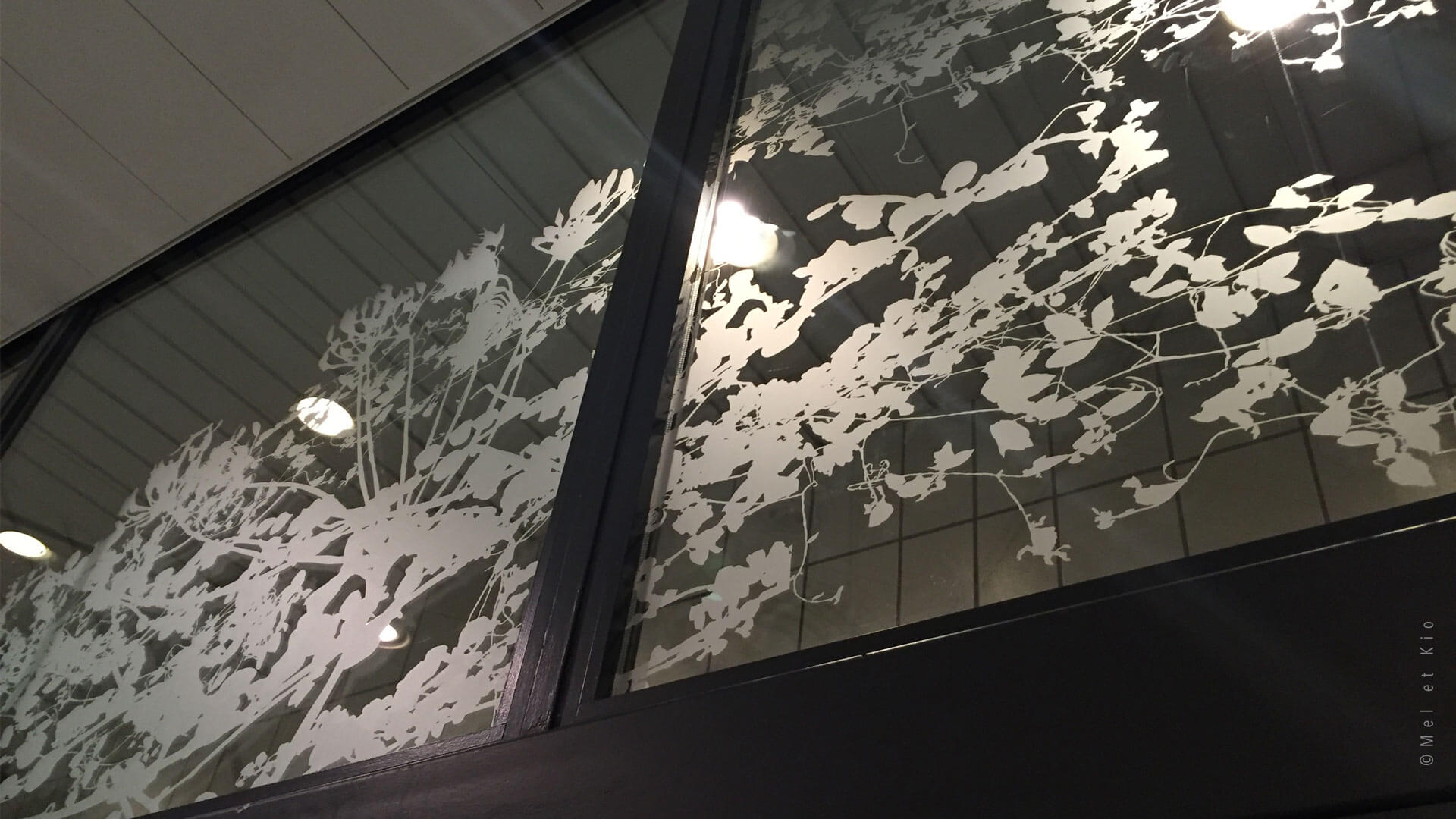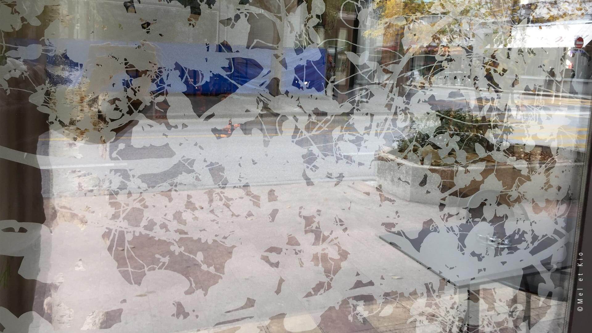 Décoration en adhésifs monochrome et dépoli sur vitres et vitrines