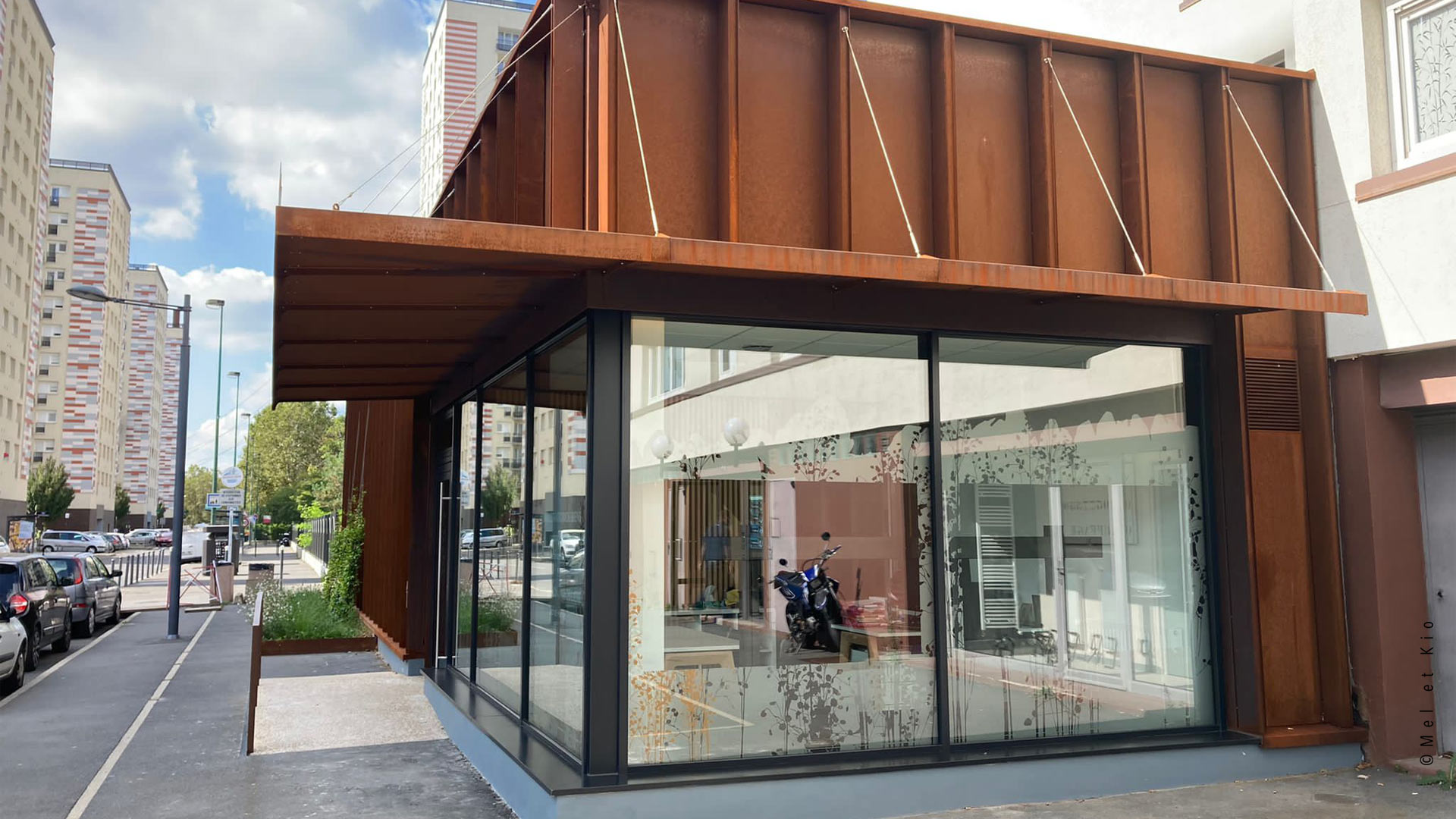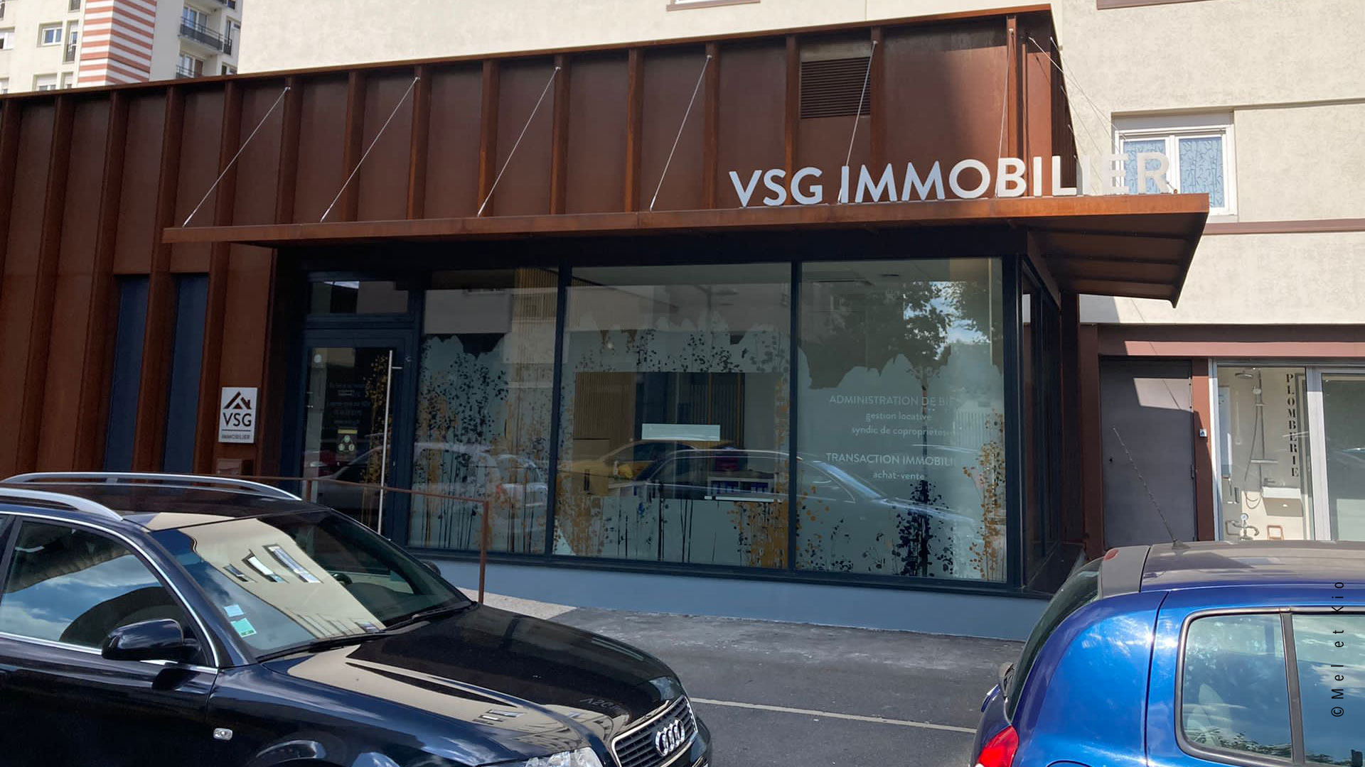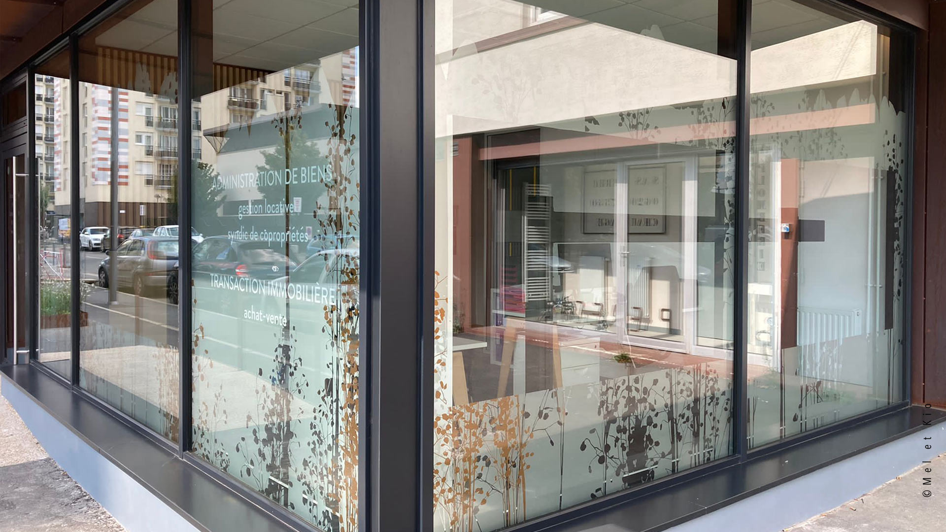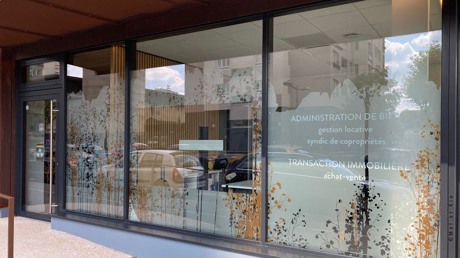 La vitrophanie signée Mel et Kio au design végétal sur la vitrine de l’agence immobilière contribue a donner une identité fort au lieu et devient un anti regards qui laisse passer la luminosité.