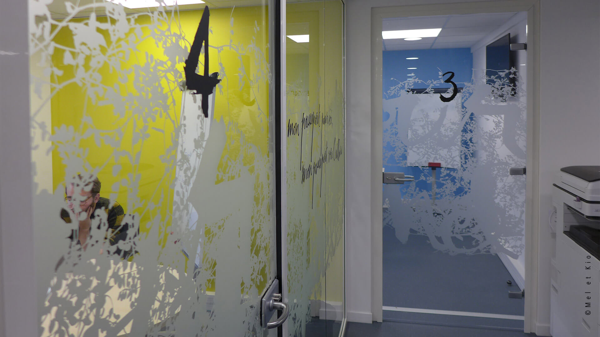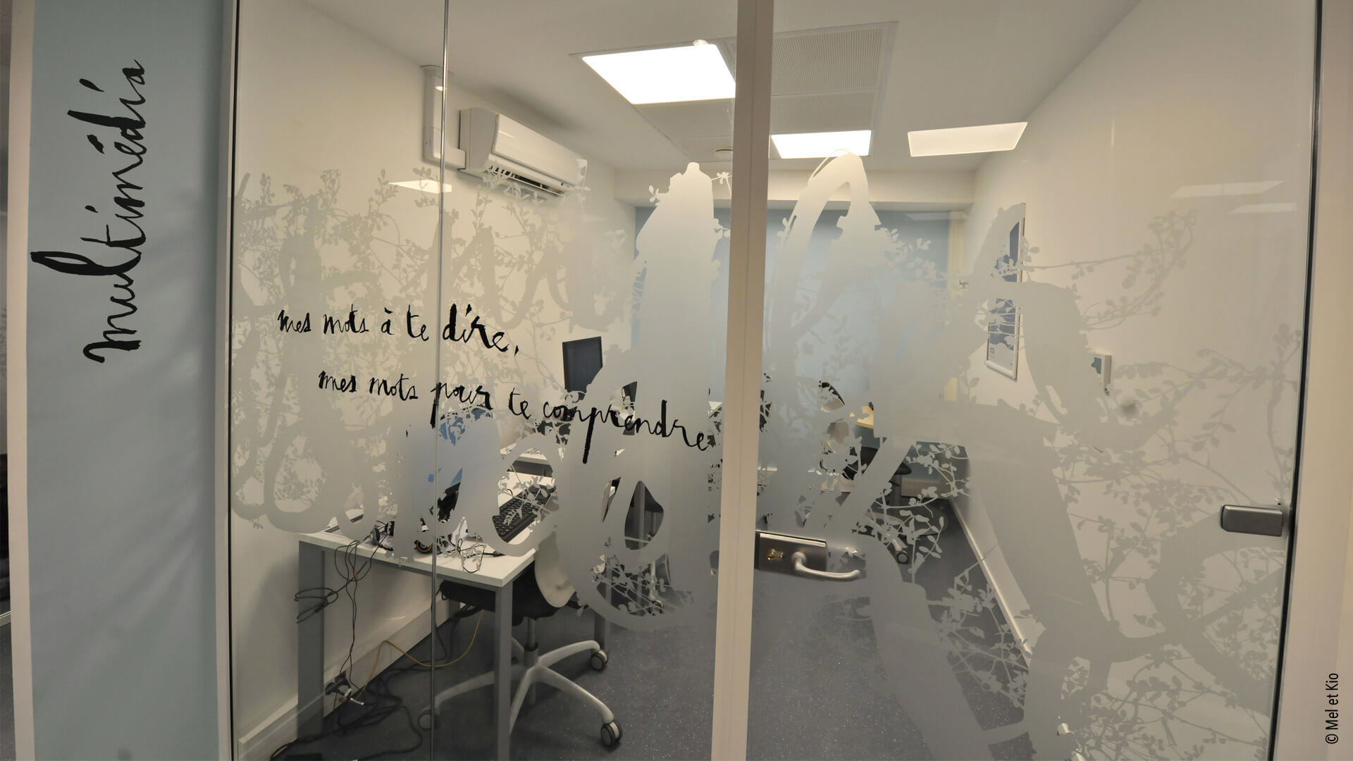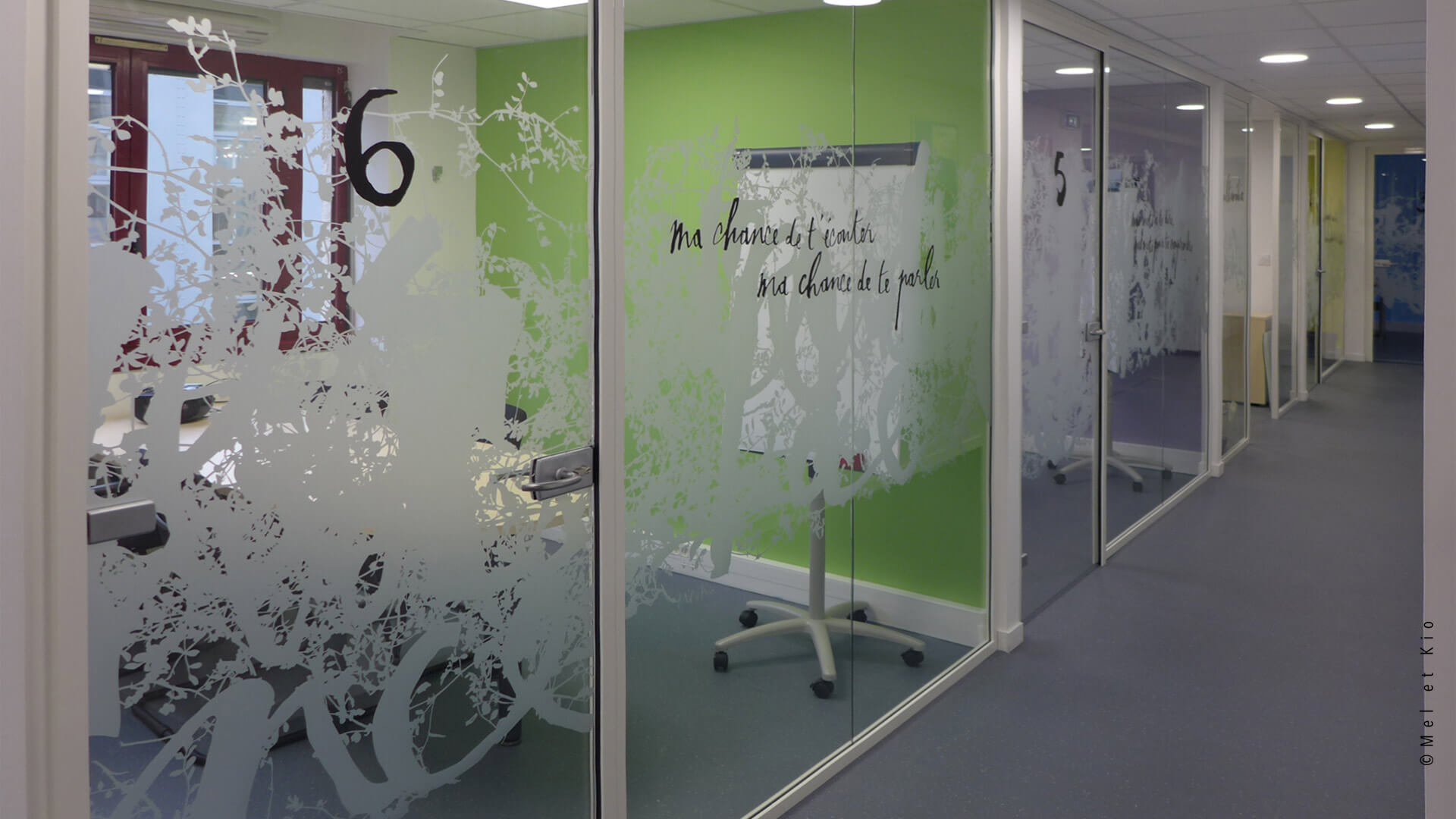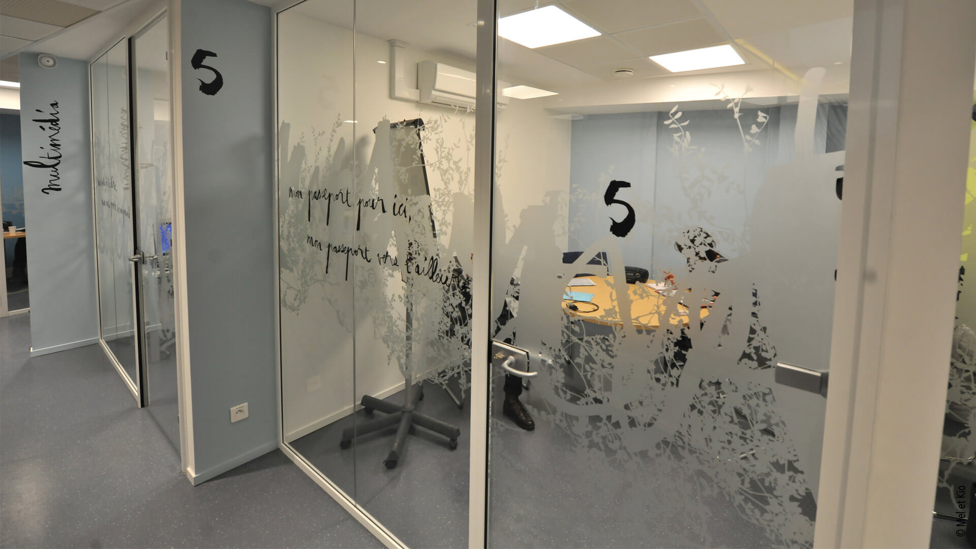 Vitrophanies de cloisons vitrées de bureaux centre de langues